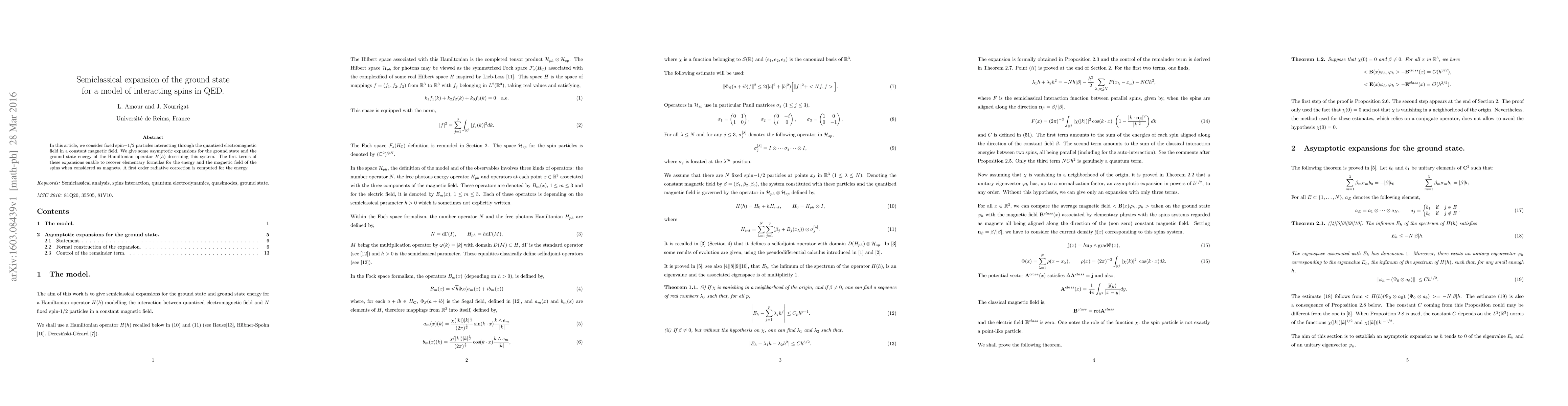 This paper explores the ground state and energy of interacting spin 1/2 particles in a constant magnetic field via quantized electromagnetic interactions, providing asymptotic expansions. It also computes a first-order radiative correction to the energy, recovering fundamental magnetic field formulas.