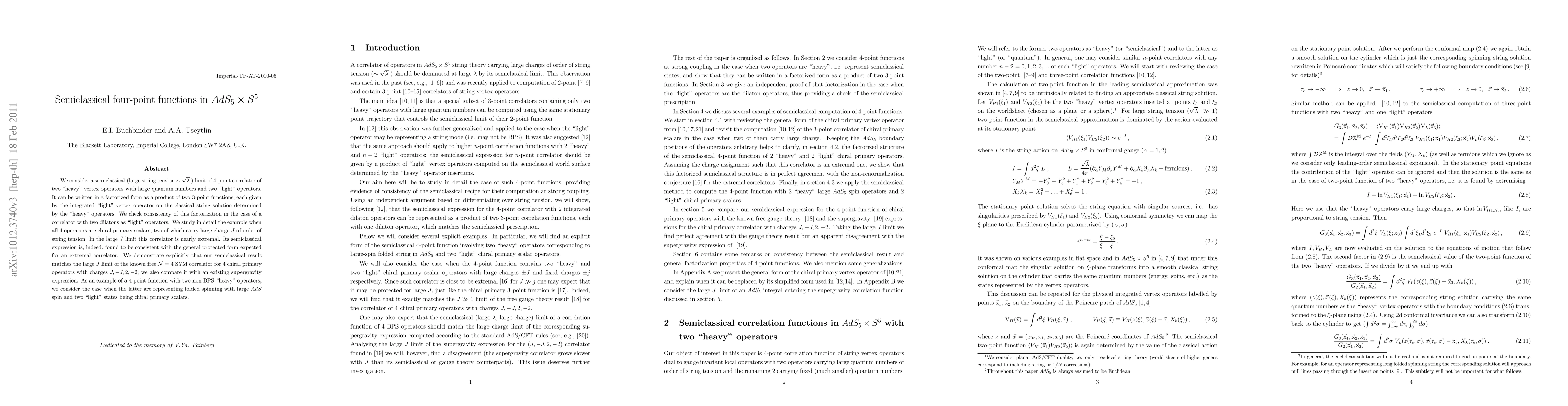 We consider a semiclassical (large string tension ~ \lambda^1/2) limit of 4-point correlator of two "heavy" vertex operators with large quantum numbers and two "light" operators. It can be written in a factorized form as a product of two 3-point functions, each given by the integrated "light" vertex operator on the classical string solution determined by the "heavy" operators. We check consistency of this factorization in the case of a correlator with two dilatons as "light" operators. We study in detail the example when all 4 operators are chiral primary scalars, two of which carry large charge J of order of string tension. In the large J limit this correlator is nearly extremal. Its semiclassical expression is, indeed, found to be consistent with the general protected form expected for an extremal correlator. We demonstrate explicitly that our semiclassical result matches the large J limit of the known free N=4 SYM correlator for 4 chiral primary operators with charges J,-J,2,-2; we also compare it with an existing supergravity expression. As an example of a 4-point function with two non-BPS "heavy" operators, we consider the case when the latter are representing folded spinning with large AdS spin and two "light" states being chiral primary scalars.