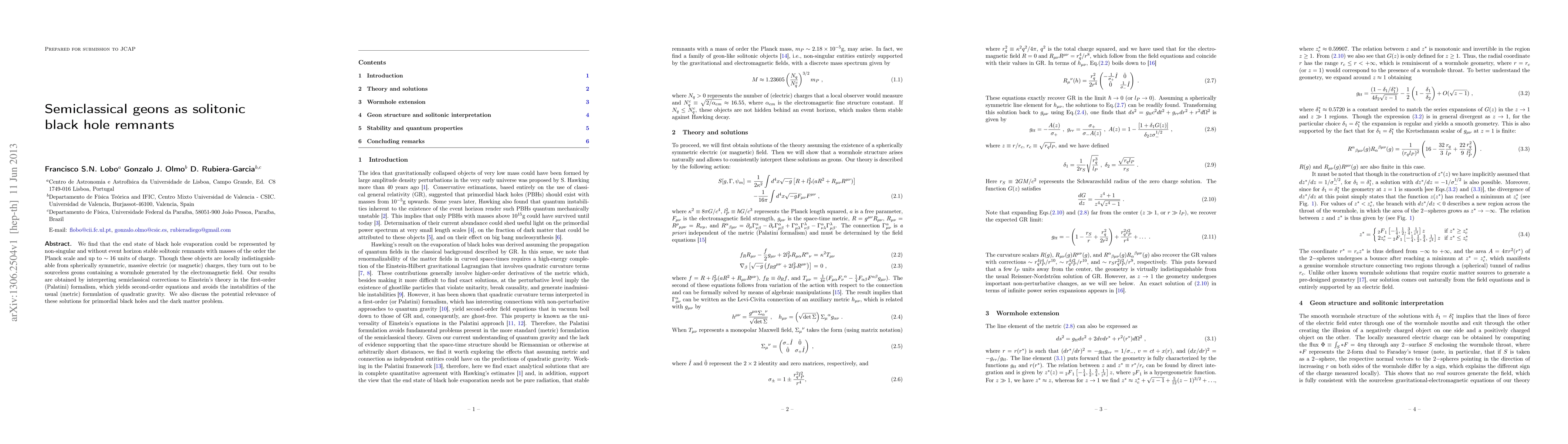 We find that the end state of black hole evaporation could be represented by non-singular and without event horizon stable solitonic remnants with masses of the order the Planck scale and up to 16 units of charge. Though these objects are locally indistinguishable from spherically symmetric, massive electric (or magnetic) charges, they turn out to be sourceless geons containing a wormhole generated by the electromagnetic field. Our results are obtained by interpreting semiclassical corrections to Einstein's theory in the first-order (Palatini) formalism, which yields second-order equations and avoids the instabilities of the usual (metric) formulation of quadratic gravity. We also discuss the potential relevance of these solutions for primordial black holes and the dark matter problem.