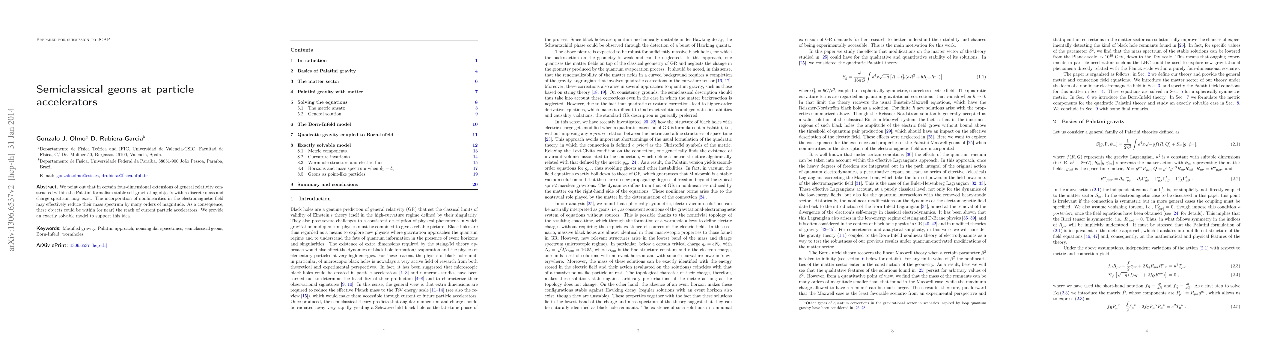 We point out that in certain four-dimensional extensions of general relativity constructed within the Palatini formalism stable self-gravitating objects with a discrete mass and charge spectrum may exist. The incorporation of nonlinearities in the electromagnetic field may effectively reduce their mass spectrum by many orders of magnitude. As a consequence, these objects could be within (or near) the reach of current particle accelerators. We provide an exactly solvable model to support this idea.