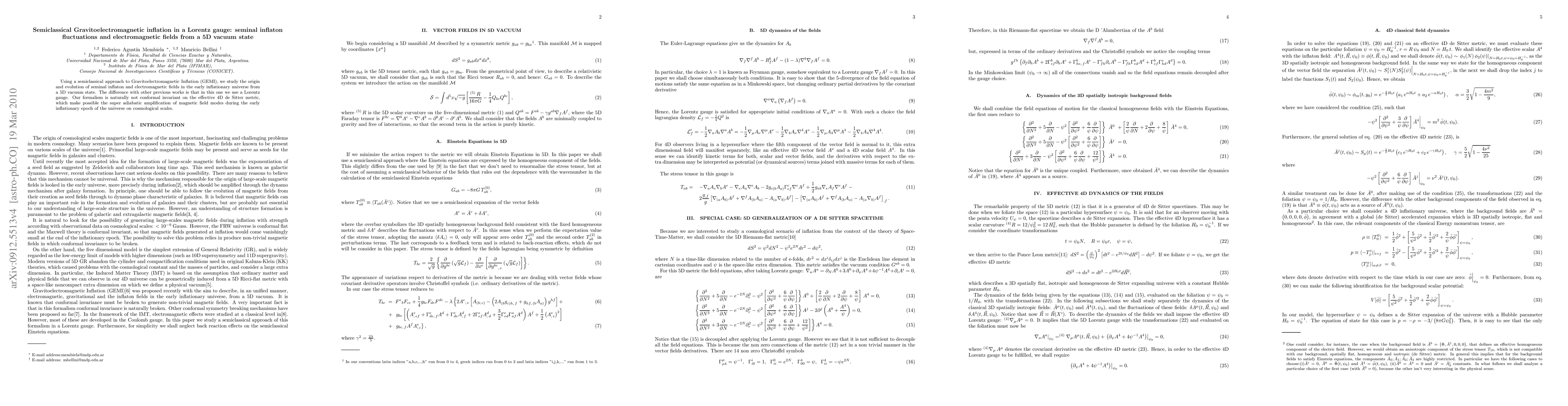 Using a semiclassical approach to Gravitoelectromagnetic Inflation (GEMI), we study the origin and evolution of seminal inflaton and electromagnetic fields in the early inflationary universe from a 5D vacuum state. The difference with other previous works is that in this one we use a Lorentz gauge. Our formalism is naturally not conformal invariant on the effective 4D de Sitter metric, which make possible the super adiabatic amplification of magnetic field modes during the early inflationary epoch of the universe on cosmological scales.