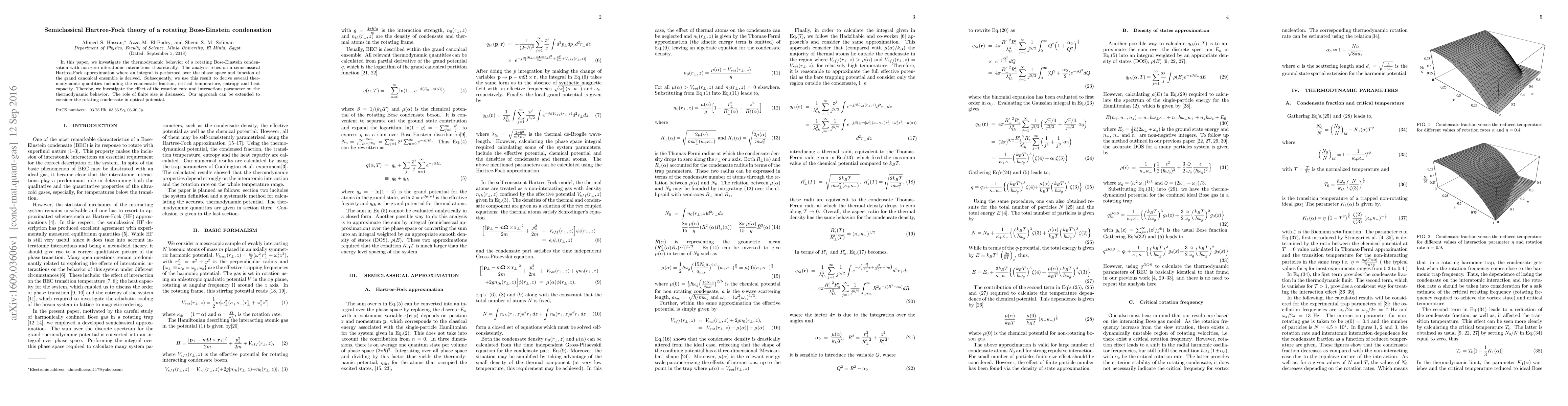 This paper uses semiclassical Hartree-Fock theory to analyze the thermodynamic behavior of rotating Bose-Einstein condensates, deriving quantities like condensate fraction and critical temperature. It examines the effects of rotation rate and interatomic interactions, and discusses the influence of finite size effects.