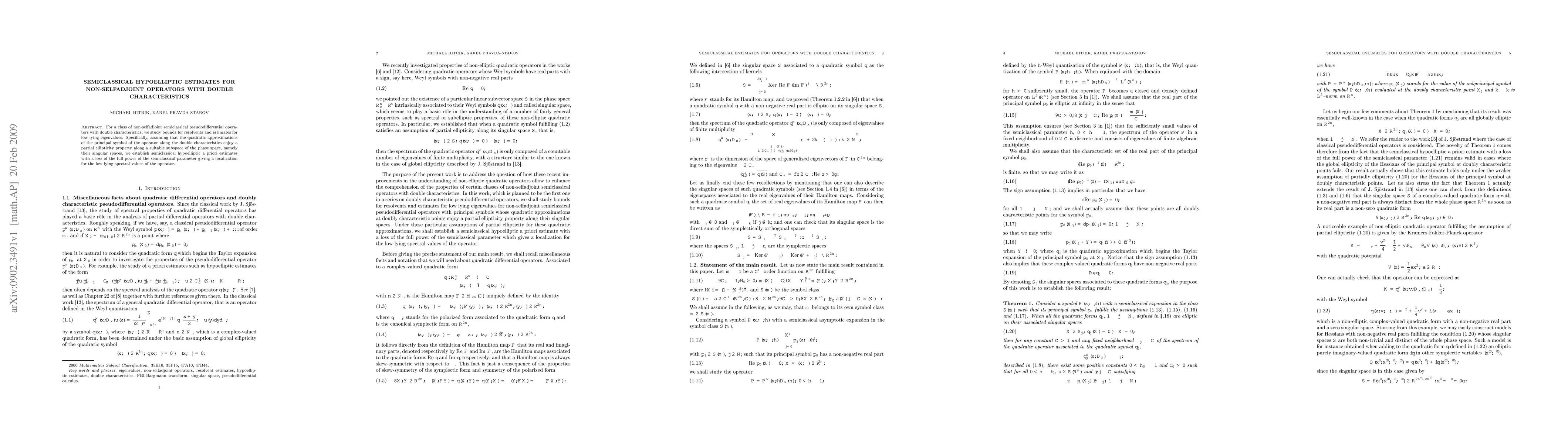 This paper investigates semiclassical hypoelliptic estimates for non-selfadjoint pseudodifferential operators with double characteristics, establishing bounds for resolvents and estimates for low lying eigenvalues under a partial ellipticity condition on the operator's principal symbol. The results provide semiclassical hypoelliptic a priori estimates with a loss of the full semiclassical parameter, localizing the spectral values of the operator.