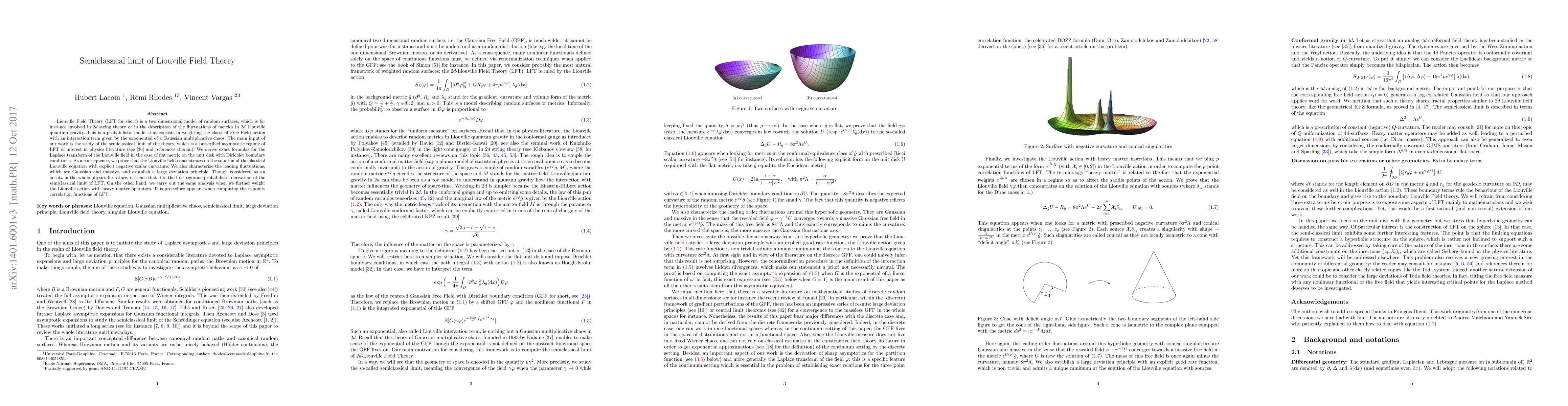 Liouville Field Theory (LFT for short) is a two dimensional model of random surfaces, which is for instance involved in $2d$ string theory or in the description of the fluctuations of metrics in $2d$ Liouville quantum gravity. This is a probabilistic model that consists in weighting the classical Free Field action with an interaction term given by the exponential of a Gaussian multiplicative chaos. The main input of our work is the study of the semiclassical limit of the theory, which is a prescribed asymptotic regime of LFT of interest in physics literature (see \cite{witten} and references therein). We derive exact formulas for the Laplace transform of the Liouville field in the case of flat metric on the unit disk with Dirichlet boundary conditions. As a consequence, we prove that the Liouville field concentrates on the solution of the classical Liouville equation with explicit negative scalar curvature. We also characterize the leading fluctuations, which are Gaussian and massive, and establish a large deviation principle. Though considered as an ansatz in the whole physics literature, it seems that it is the first rigorous probabilistic derivation of the semiclassical limit of LFT. On the other hand, we carry out the same analysis when we further weight the Liouville action with heavy matter operators. This procedure appears when computing the $n$-points correlation functions of LFT.
