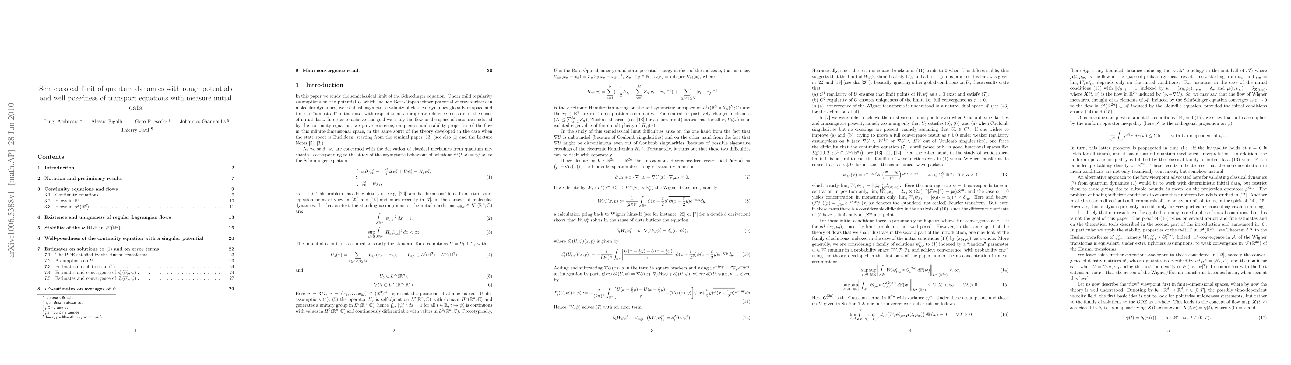 This paper investigates the semiclassical limit of the Schrödinger equation under mild potential regularity conditions, including Born-Oppenheimer potentials. It establishes the global asymptotic validity of classical dynamics for almost all initial data, leveraging existence, uniqueness, and stability of measure-valued solutions to the continuity equation.