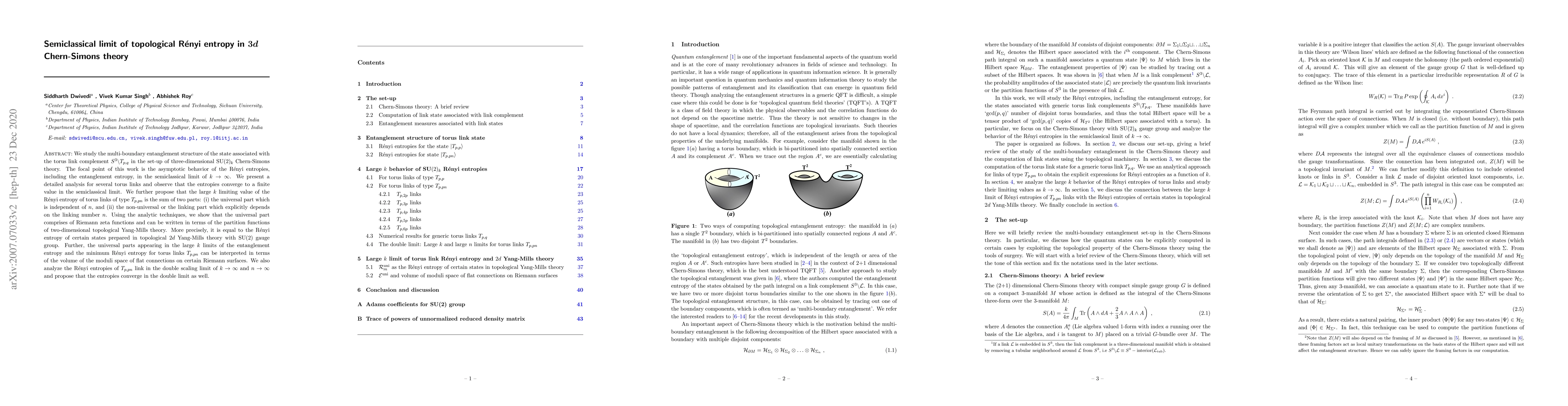 This paper investigates the entanglement structure in $3d$ Chern-Simons theory, focusing on the semiclassical limit of large $k$ values. It reveals that the R\'enyi entropies converge to a finite value, composed of universal and linking parts, with the universal part linked to the partition functions of $2d$ topological Yang-Mills theory and the volume of moduli spaces of flat connections.
