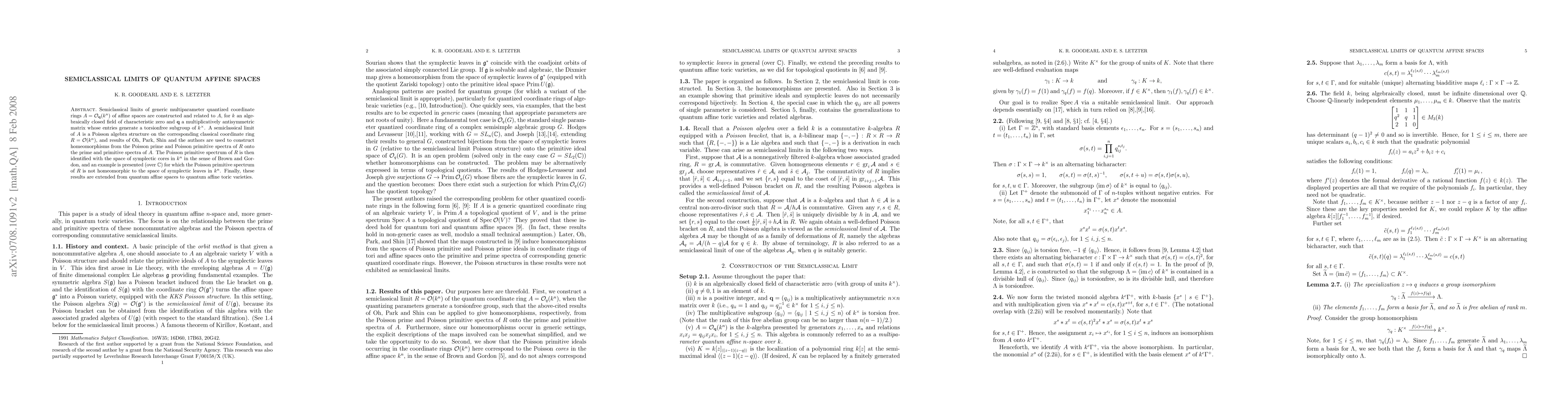 This paper constructs semiclassical limits of quantum affine spaces by establishing a Poisson algebra structure on classical coordinate rings, and it uses these limits to create homeomorphisms between the spectra of quantum and classical spaces. It also extends these findings to quantum affine toric varieties.