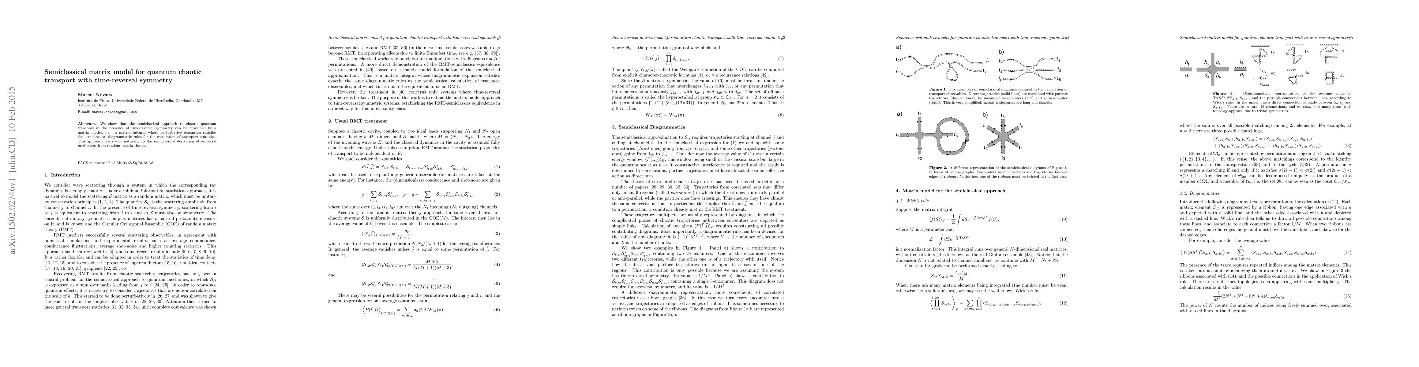 This paper demonstrates that chaotic quantum transport with time-reversal symmetry can be modeled using a semiclassical matrix model, providing a perturbative expansion that aligns with semiclassical diagrammatic rules and yields universal predictions from random matrix theory.