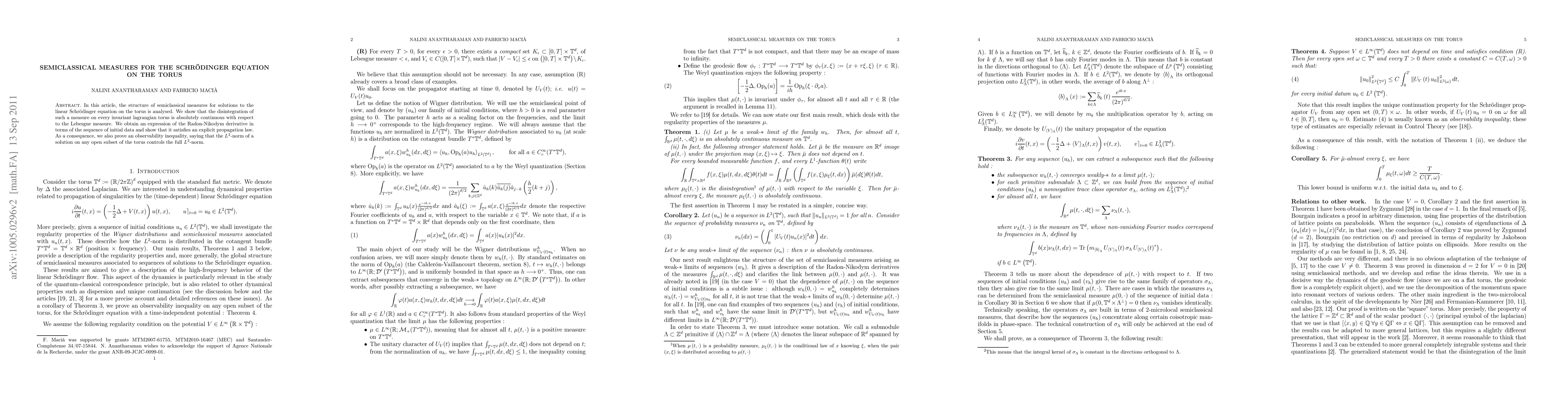 This research explores semiclassical measures for the Schrödinger equation on a torus, demonstrating their absolute continuity with respect to Lebesgue measure along invariant lagrangian tori. It provides an expression for the Radon-Nikodym derivative and establishes an observability inequality, indicating that the L^2-norm of a solution on any torus subset controls the full L^2-norm.