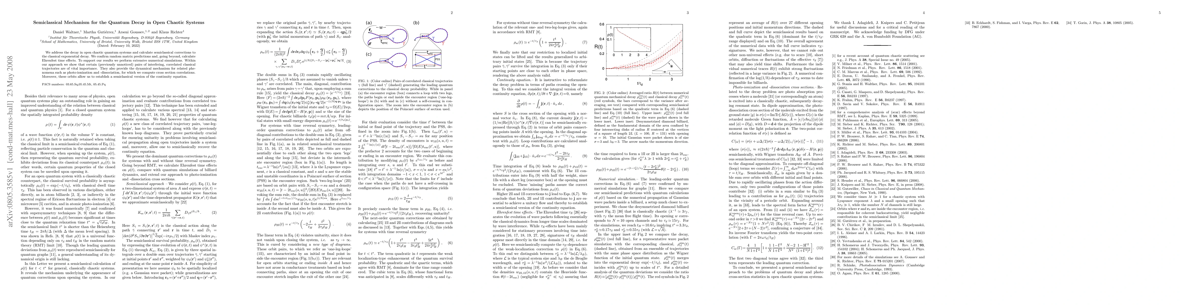 This paper investigates quantum decay in open chaotic systems, providing semiclassical corrections to classical exponential decay and confirming random matrix predictions. It identifies previously unnoticed pairs of correlated classical trajectories that play a crucial role in phenomena like photo-ionization and dissociation, and establishes a semiclassical continuity equation.
