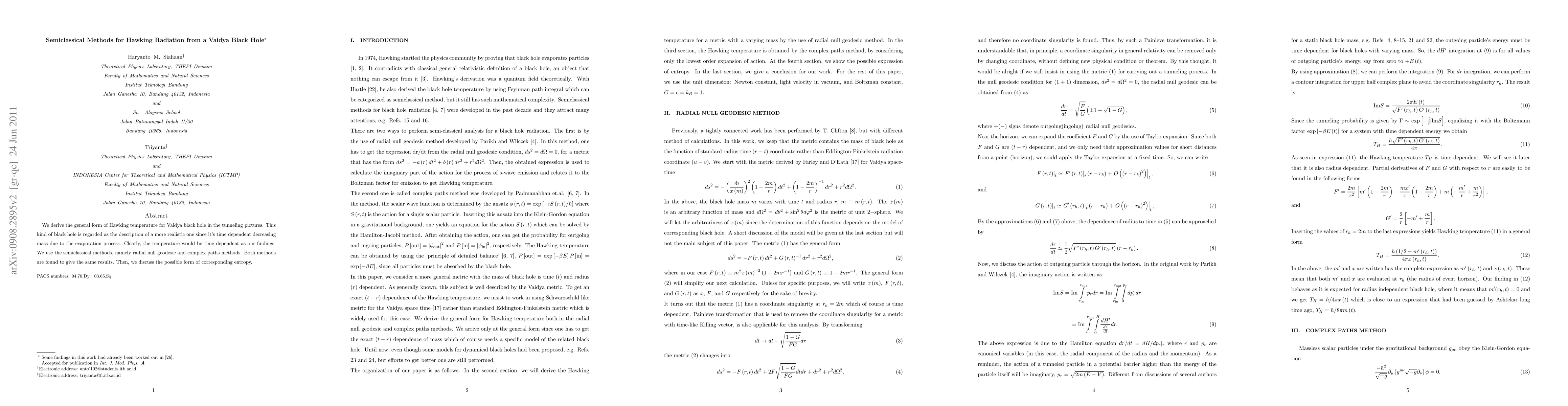 This paper derives the time-dependent Hawking temperature for a Vaidya black hole using semiclassical methods, showing that both the radial null geodesic and complex paths methods yield consistent results. The study also explores the implications for the black hole's entropy.