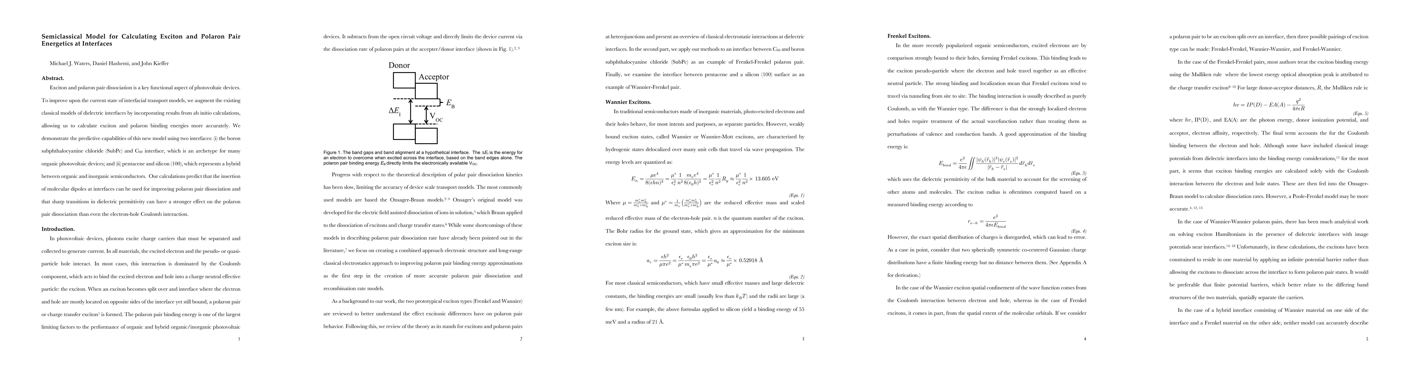 Exciton and polaron pair dissociation is a key functional aspect of photovoltaic devices. To improve upon the current state of interfacial transport models, we augment the existing classical models of dielectric interfaces by incorporating results from ab initio calculations, allowing us to calculate exciton and polaron binding energies more accurately. We demonstrate the predictive capabilities of this new model using two interfaces: (i) the boron subphthalocyanine chloride (SubPc) and C60 interface, which is an archetype for many organic photovoltaic devices; and (ii) pentacene and silicon (100), which represents a hybrid between organic and inorganic semiconductors. Our calculations predict that the insertion of molecular dipoles at interfaces can be used for improving polaron pair dissociation and that sharp transitions in dielectric permittivity can have a stronger effect on the polaron pair dissociation than even the electron-hole Coulomb interaction.
