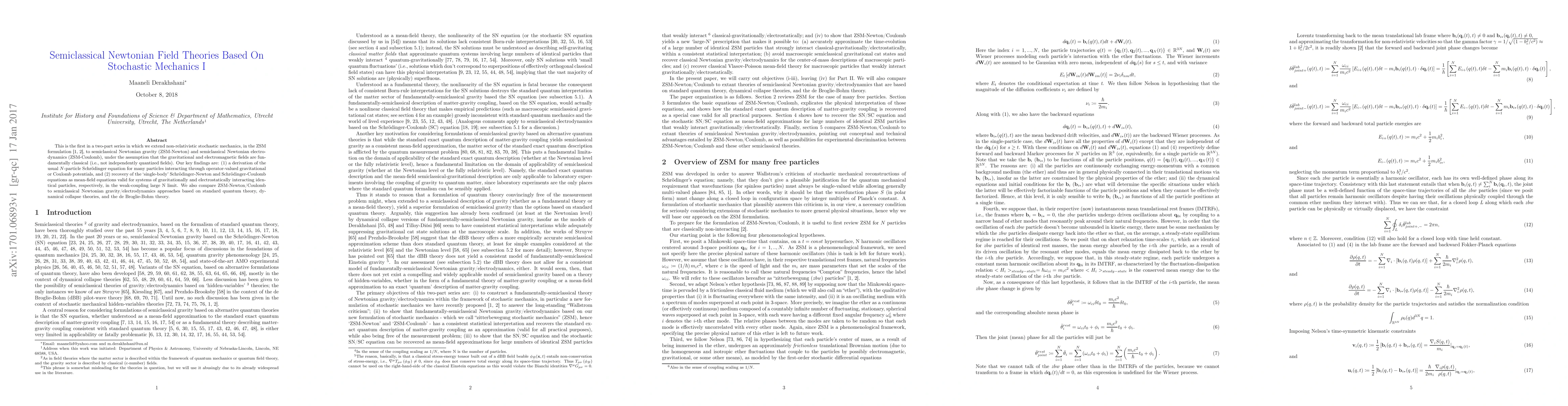 This is the first in a two-part series in which we extend non-relativistic stochastic mechanics, in the ZSM formulation [1, 2], to semiclassical Newtonian gravity (ZSM-Newton) and semiclassical Newtonian electrodynamics (ZSM-Coulomb), under the assumption that the gravitational and electromagnetic fields are fundamentally classical (i.e., not independently quantized fields). Our key findings are: (1) a derivation of the usual $N$-particle Schr{\"o}dinger equation for many particles interacting through operator-valued gravitational or Coulomb potentials, and (2) recovery of the `single-body' Schr{\"o}dinger-Newton and Schr{\"o}dinger-Coulomb equations as mean-field equations valid for systems of gravitationally and electrostatically interacting identical particles, respectively, in the weak-coupling large N limit. We also compare ZSM-Newton/Coulomb to semiclassical Newtonian gravity/electrodynamics approaches based on standard quantum theory, dynamical collapse theories, and the de Broglie-Bohm theory.