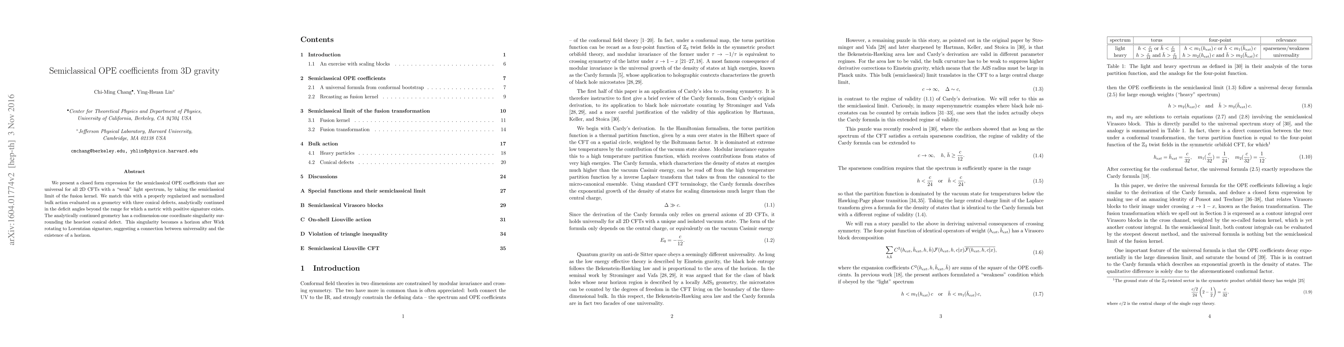 We present a closed form expression for the semiclassical OPE coefficients that are universal for all 2D CFTs with a "weak" light spectrum, by taking the semiclassical limit of the fusion kernel. We match this with a properly regularized and normalized bulk action evaluated on a geometry with three conical defects, analytically continued in the deficit angles beyond the range for which a metric with positive signature exists. The analytically continued geometry has a codimension-one coordinate singularity surrounding the heaviest conical defect. This singularity becomes a horizon after Wick rotating to Lorentzian signature, suggesting a connection between universality and the existence of a horizon.