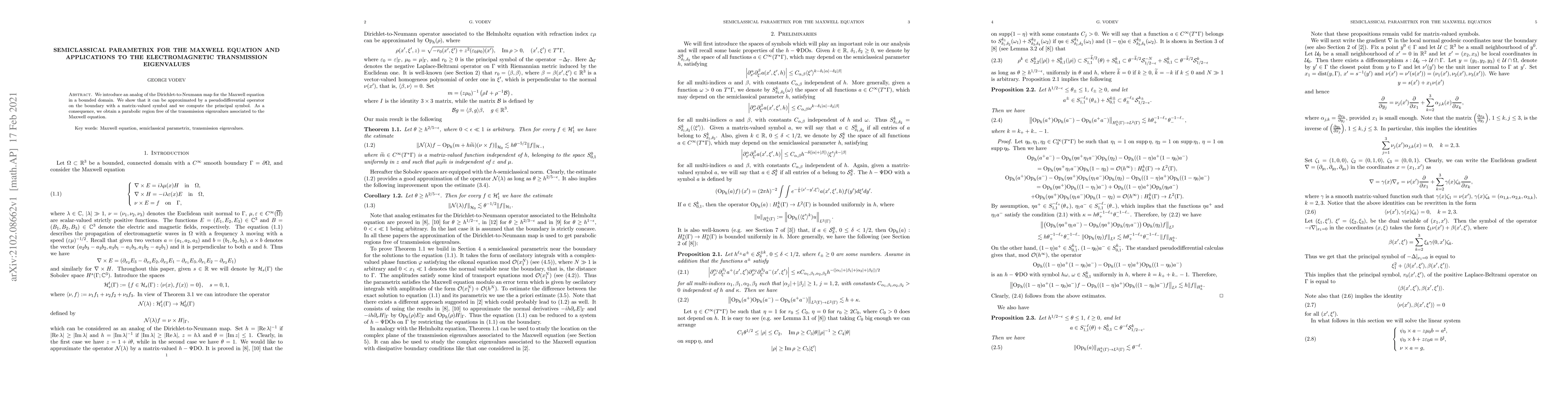 Summary: This paper develops a semiclassical parametrix for the Maxwell equation, approximating the Dirichlet-to-Neumann map with a pseudodifferential operator, and identifies a parabolic region free from electromagnetic transmission eigenvalues.