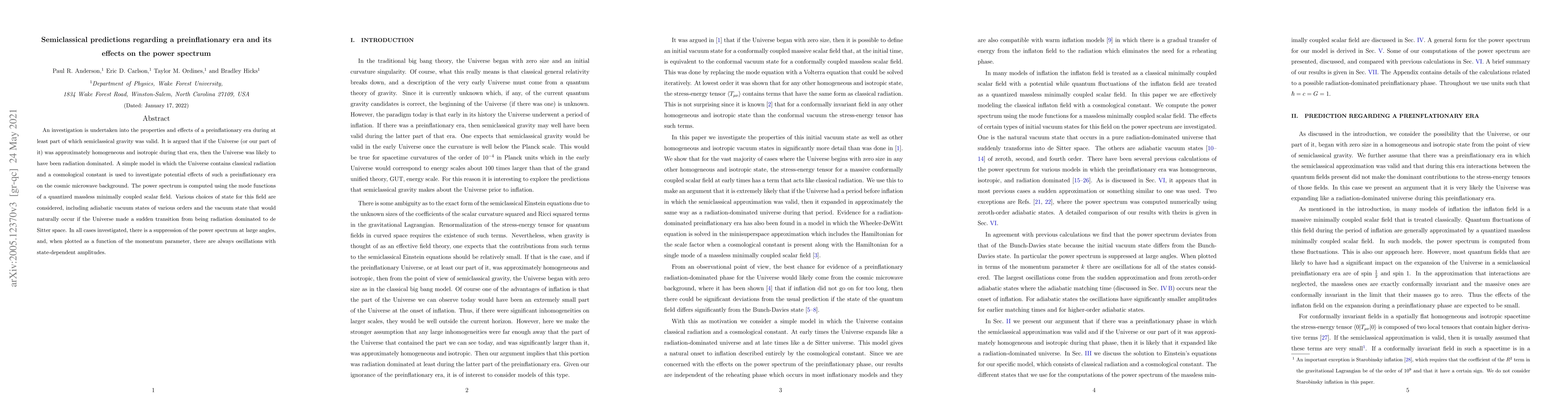 An investigation is undertaken into the properties and effects of a preinflationary era during at least part of which semiclassical gravity was valid. It is argued that if the Universe (or our part of it) was approximately homogeneous and isotropic during that era, then the Universe was likely to have been radiation dominated. A simple model in which the Universe contains classical radiation and a cosmological constant is used to investigate potential effects of such a preinflationary era on the cosmic microwave background. The power spectrum is computed using the mode functions of a quantized massless minimally coupled scalar field. Various choices of state for this field are considered, including adiabatic vacuum states of various orders and the vacuum state that would naturally occur if the Universe made a sudden transition from being radiation dominated to de Sitter space. In all cases investigated, there is a suppression of the power spectrum at large angles, and, when plotted as a function of the momentum parameter, there are always oscillations with state-dependent amplitudes.