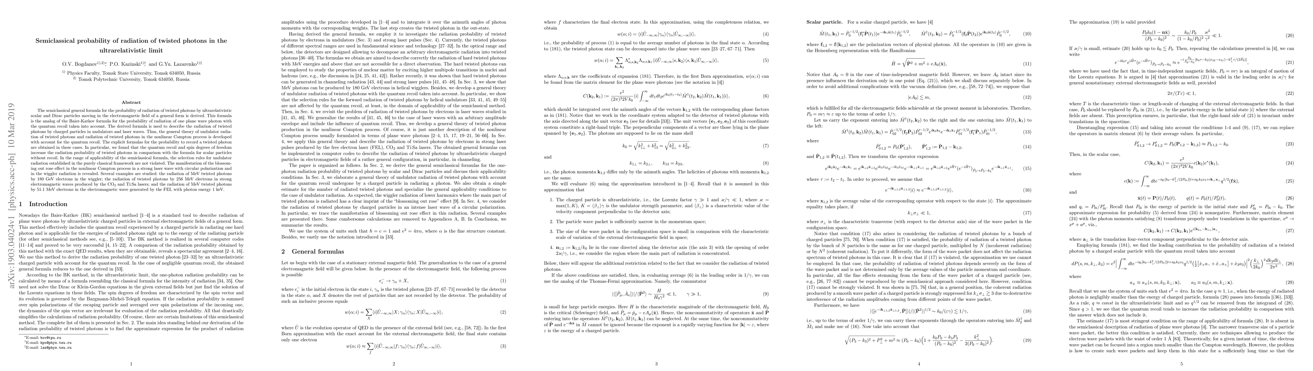 This paper derives a semiclassical formula for the probability of radiation of twisted photons by ultrarelativistic particles, analogous to the Baier-Katkov formula, and applies it to describe twisted photon radiation in undulators and nonlinear Compton processes, revealing increased radiation probability due to quantum recoil and spin effects.
