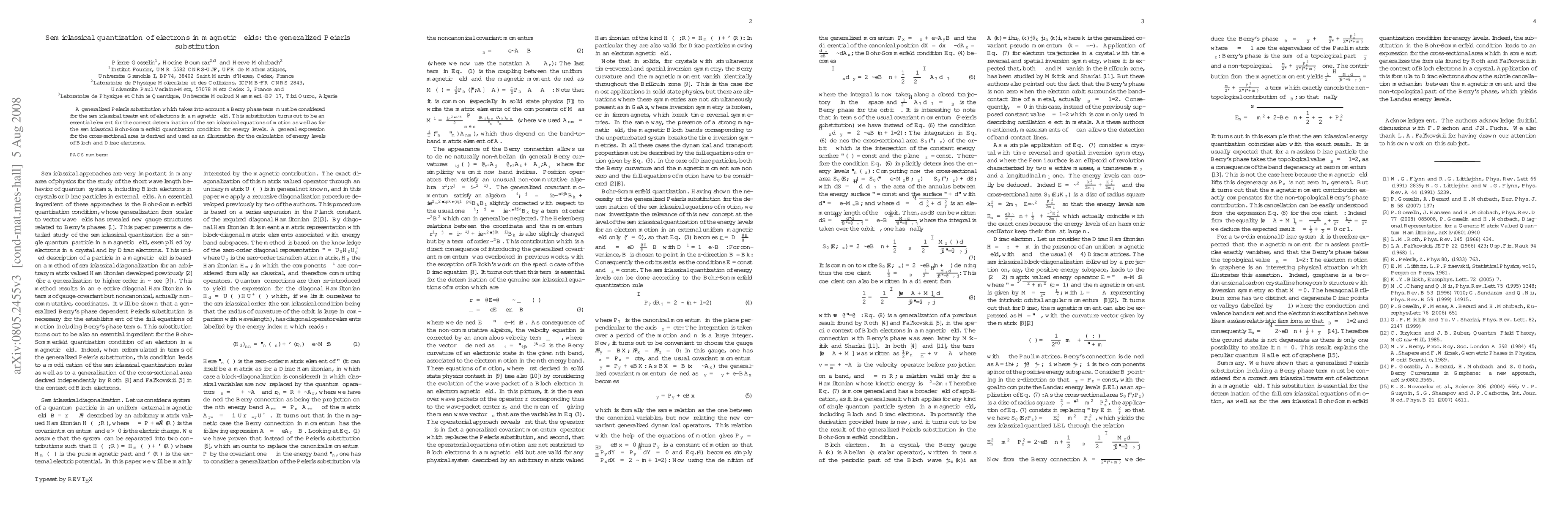Summary: This paper proposes a generalized Peierls substitution incorporating a Berry phase term for semiclassical electron quantization in magnetic fields, essential for accurate equations of motion and Bohr-Sommerfeld quantization conditions, with a derived expression for cross-sectional area used to calculate energy levels of Bloch and Dirac electrons.