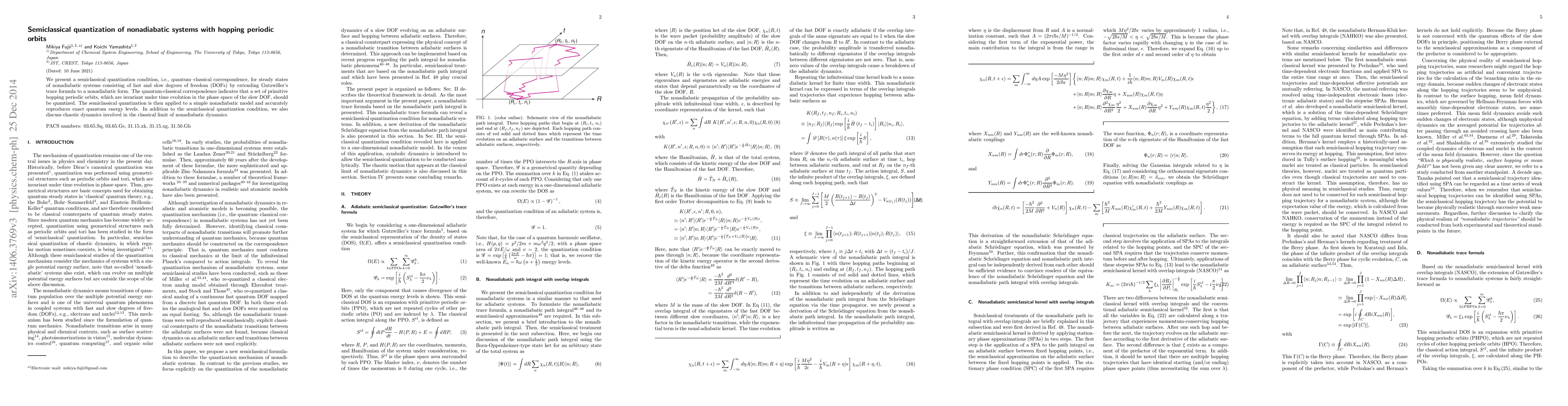 This paper develops a semiclassical quantization method for nonadiabatic systems with fast and slow degrees of freedom, extending Gutzwiller's trace formula to include nonadiabatic effects. The method accurately reproduces exact quantum energy levels by quantizing primitive hopping periodic orbits in the phase space of slow degrees of freedom.