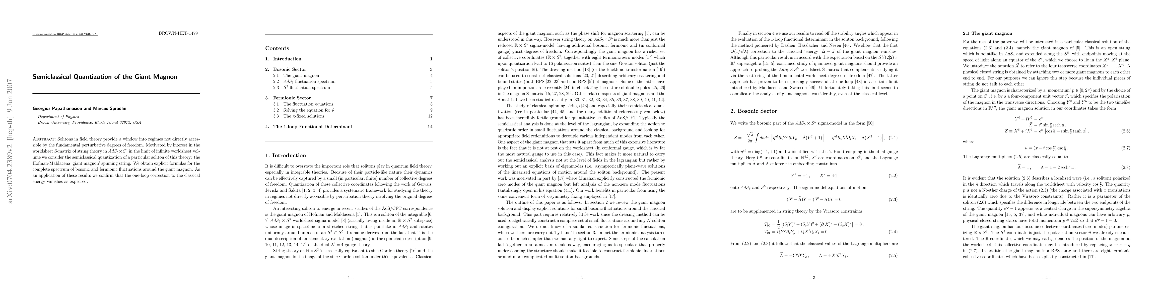Researchers quantized a giant magnon in string theory using semiclassical methods, finding explicit formulas for bosonic and fermionic fluctuations around the soliton. The results confirm that one-loop corrections to classical energy vanish as expected.