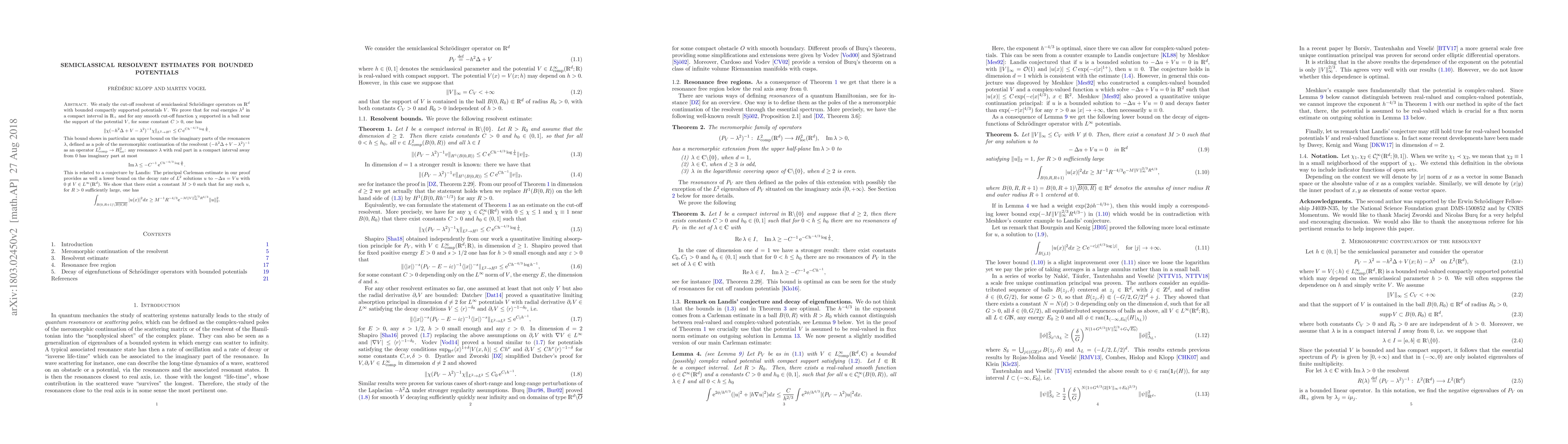 We study the cut-off resolvent of semiclassical Schr{\"o}dinger operators on $\mathbb{R}^d$ with bounded compactly supported potentials $V$. We prove that for real energies $\lambda^2$ in a compact interval in $\mathbb{R}_+$ and for any smooth cut-off function $\chi$ supported in a ball near the support of the potential $V$, for some constant $C>0$, one has \begin{equation*} \| \chi (-h^2\Delta + V-\lambda^2)^{-1} \chi \|_{L^2\to H^1} \leq C \,\mathrm{e}^{Ch^{-4/3}\log \frac{1}{h} }. \end{equation*} This bound shows in particular an upper bound on the imaginary parts of the resonances $\lambda$, defined as a pole of the meromorphic continuation of the resolvent $(-h^2\Delta + V-\lambda^2)^{-1}$ as an operator $L^2_{\mathrm{comp}}\to H^2_{\mathrm{loc}}$: any resonance $\lambda$ with real part in a compact interval away from $0$ has imaginary part at most \begin{equation*} \mathrm{Im} \lambda \leq - C^{-1} \,\mathrm{e}^{Ch^{-4/3}\log \frac{1}{h} }. \end{equation*} This is related to a conjecture by Landis: The principal Carleman estimate in our proof provides as well a lower bound on the decay rate of $L^2$ solutions $u$ to $-\Delta u = Vu$ with $0\not\equiv V\in L^{\infty}(\mathbb{R}^d)$. We show that there exist a constant $M>0$ such that for any such $u$, for $R>0$ sufficiently large, one has \begin{equation*} \int_{B(0,R+1)\backslash \overline{B(0,R)}}|u(x)|^2 dx \geq M^{-1}R^{-4/3} \mathrm{e}^{-M \|V\|_{\infty}^{2/3} R^{4/3}}\|u\|^2_2. \end{equation*}