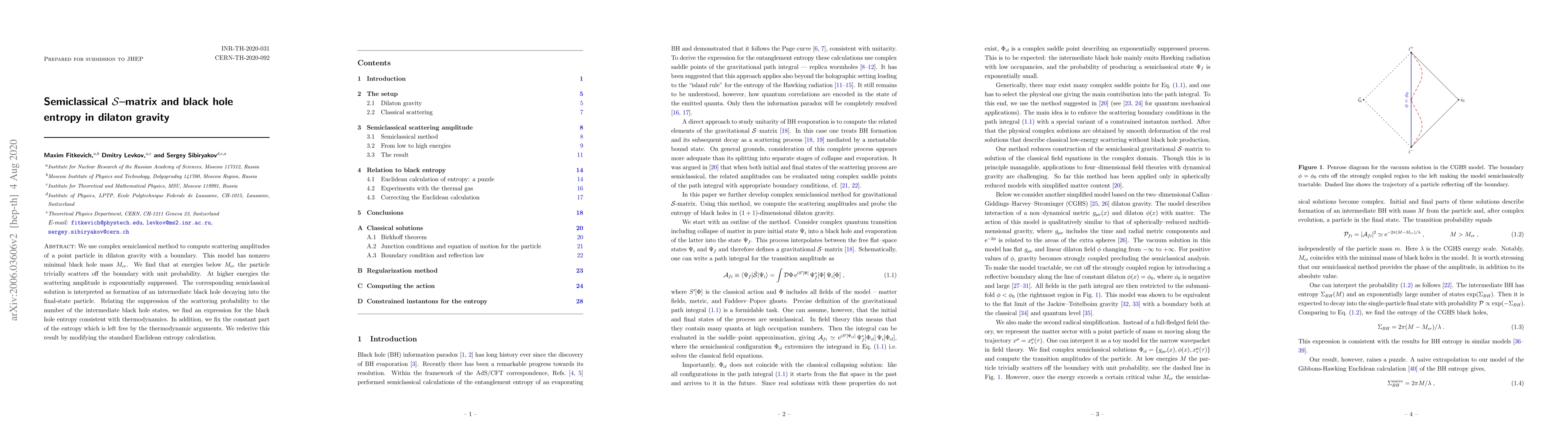 This paper computes scattering amplitudes in dilaton gravity using a semiclassical method, finding that low-energy particles scatter off the boundary with unit probability while high-energy scattering is exponentially suppressed, interpreted as intermediate black hole formation. The derived black hole entropy aligns with thermodynamic principles and fixes the constant part of the entropy.