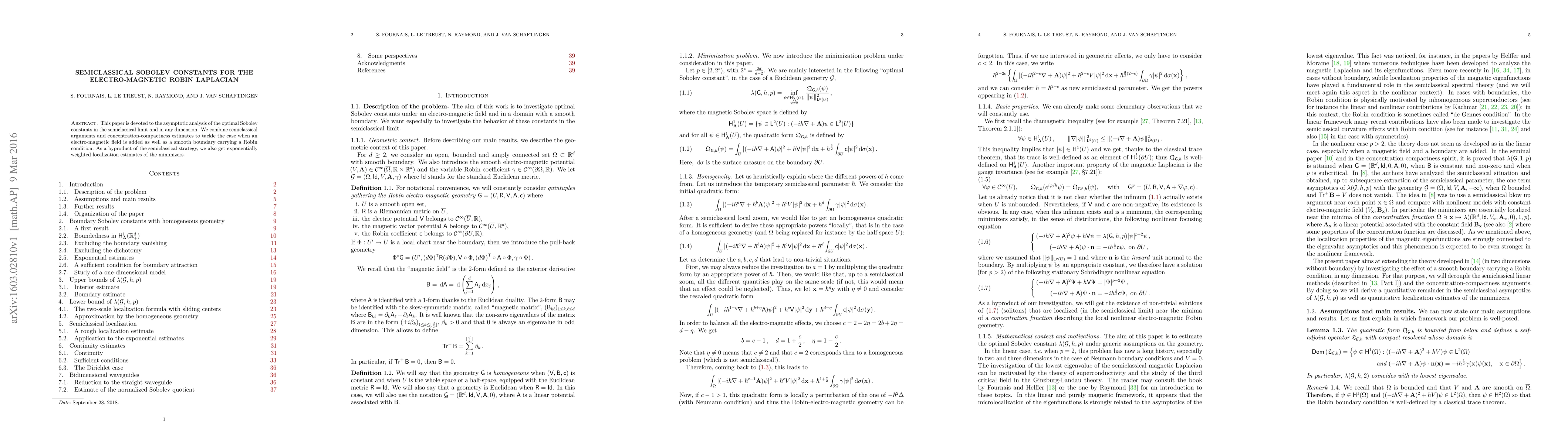 This paper is devoted to the asymptotic analysis of the optimal Sobolev constants in the semiclassical limit and in any dimension. We combine semiclassical arguments and concentration-compactness estimates to tackle the case when an electromagnetic field is added as well as a smooth boundary carrying a Robin condition. As a byproduct of the semiclassical strategy, we also get exponentially weighted localization estimates of the minimizers.