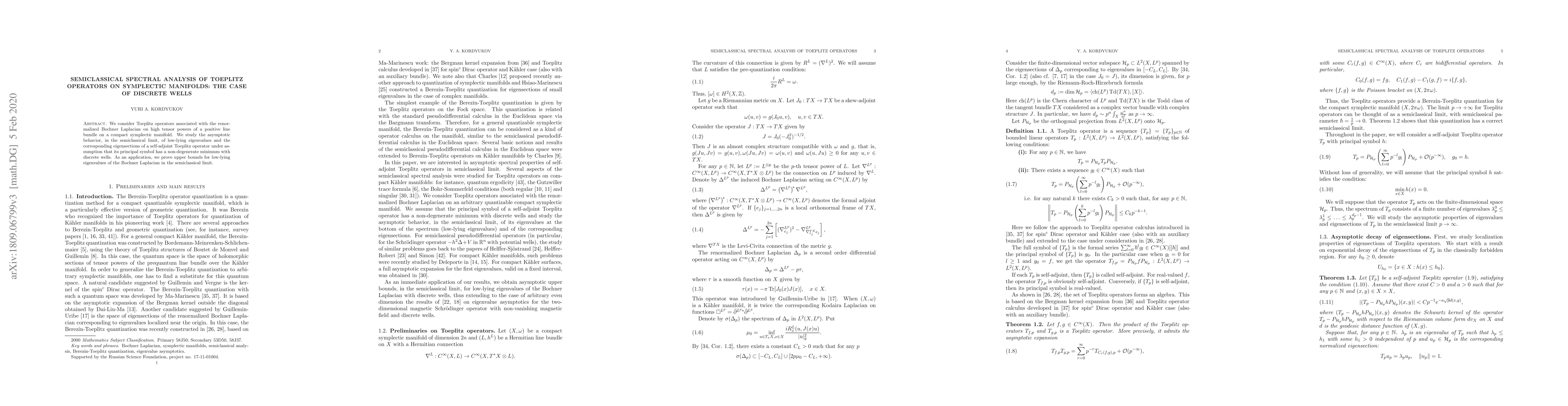 This paper investigates the asymptotic behavior of low-lying eigenvalues and eigenfunctions of Toeplitz operators on symplectic manifolds, focusing on cases with discrete wells. It provides upper bounds for the eigenvalues of the Bochner-Laplacian in the semiclassical limit.