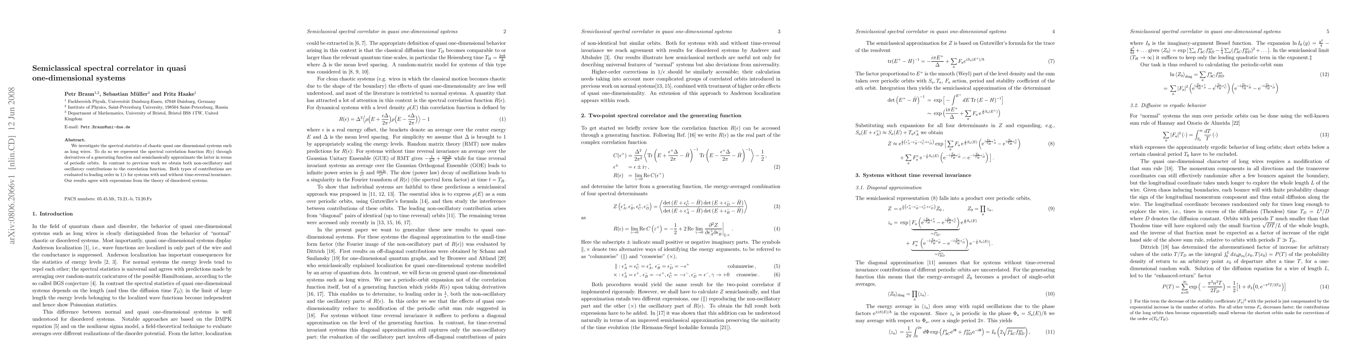 We investigate the spectral statistics of chaotic quasi one dimensional systems such as long wires. To do so we represent the spectral correlation function $R(\epsilon)$ through derivatives of a generating function and semiclassically approximate the latter in terms of periodic orbits. In contrast to previous work we obtain both non-oscillatory and oscillatory contributions to the correlation function. Both types of contributions are evaluated to leading order in $1/\epsilon$ for systems with and without time-reversal invariance. Our results agree with expressions from the theory of disordered systems.