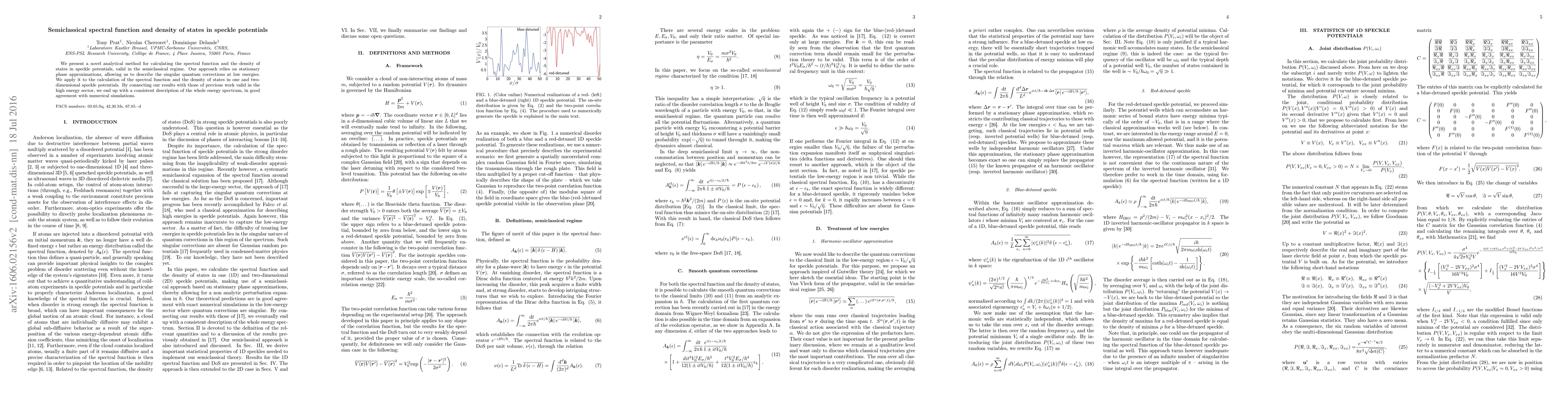 This paper introduces a new analytical method for calculating the spectral function and density of states in speckle potentials using semiclassical approximations. The method, based on stationary phase approximations, accurately describes quantum corrections at low energies and is applied to both one and two-dimensional cases, showing good agreement with numerical simulations.