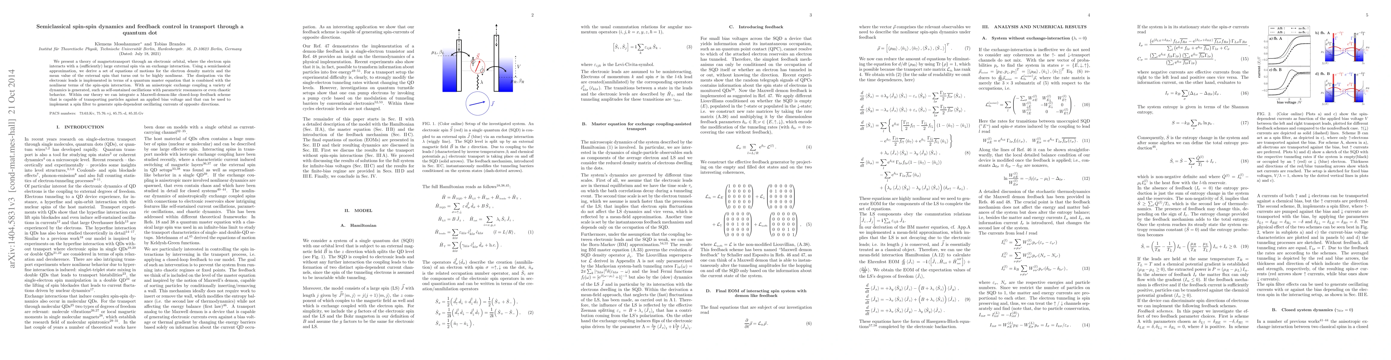 We present a theory of magnetotransport through an electronic orbital, where the electron spin interacts with a (sufficiently) large external spin via an exchange interaction. Using a semiclassical approximation, we derive a set of equations of motions for the electron density matrix and the mean value of the external spin that turns out to be highly nonlinear. The dissipation via the electronic leads is implemented in terms of a quantum master equation that is combined with the nonlinear terms of the spin-spin interaction. With an anisotropic exchange coupling a variety of dynamics is generated, such as self-sustained oscillations with parametric resonances or even chaotic behavior. Within our theory we can integrate a Maxwell-demon-like closed-loop feedback scheme that is capable of transporting particles against an applied bias voltage and that can be used to implement a spin filter to generate spin-dependent oscillating currents of opposite directions.