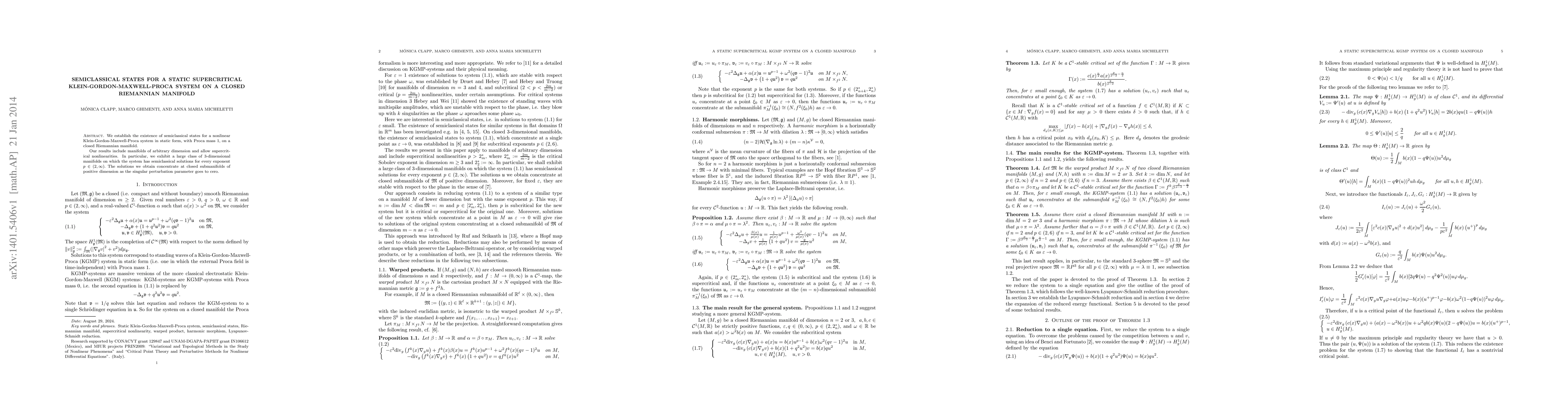This paper establishes the existence of semiclassical states for a static nonlinear Klein-Gordon-Maxwell-Proca system on closed Riemannian manifolds, including those of arbitrary dimension and supercritical nonlinearities. The authors demonstrate that a wide range of 3-dimensional manifolds support semiclassical solutions for exponents greater than 2, which concentrate on positive-dimensional submanifolds as the perturbation parameter approaches zero.