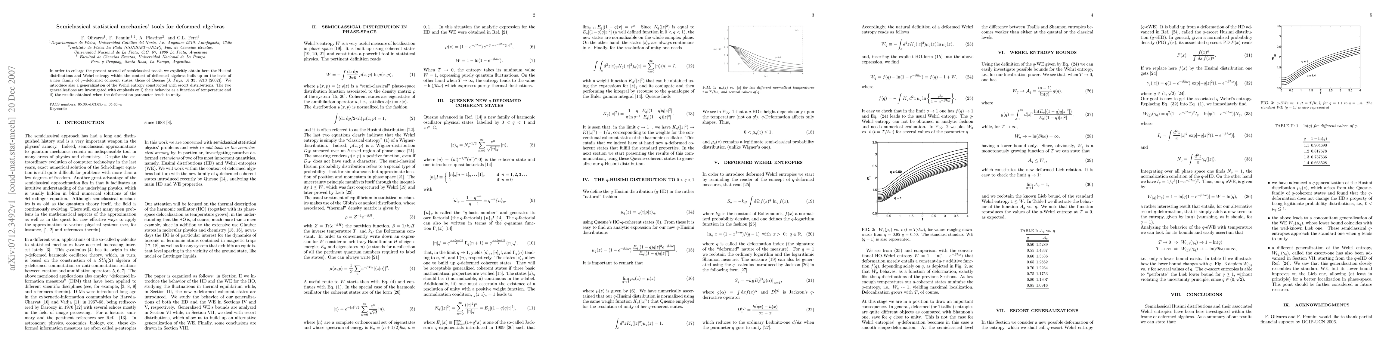 In order to enlarge the present arsenal of semiclassical toools we explicitly obtain here the Husimi distributions and Wehrl entropy within the context of deformed algebras built up on the basis of a new family of q-deformed coherent states, those of Quesne [J. Phys. A 35, 9213 (2002)]. We introduce also a generalization of the Wehrl entropy constructed with escort distributions. The two generalizations are investigated with emphasis on i) their behavior as a function of temperature and ii) the results obtained when the deformation-parameter tends to unity.