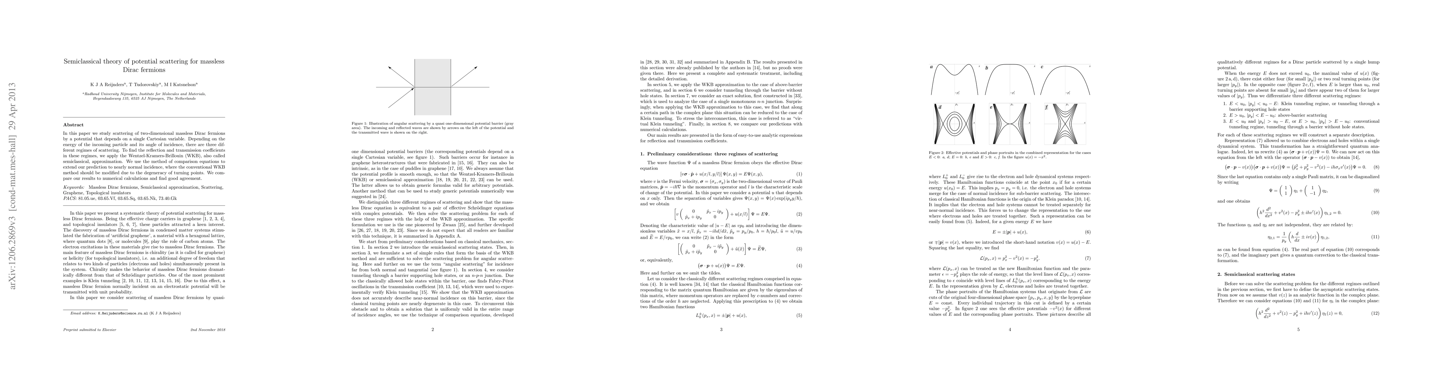 This paper investigates the scattering of two-dimensional massless Dirac fermions by a potential, employing the Wentzel-Kramers-Brillouin (WKB) approximation to determine reflection and transmission coefficients across three scattering regimes. The method of comparison equations is used to extend predictions to nearly normal incidence, showing good agreement with numerical calculations.