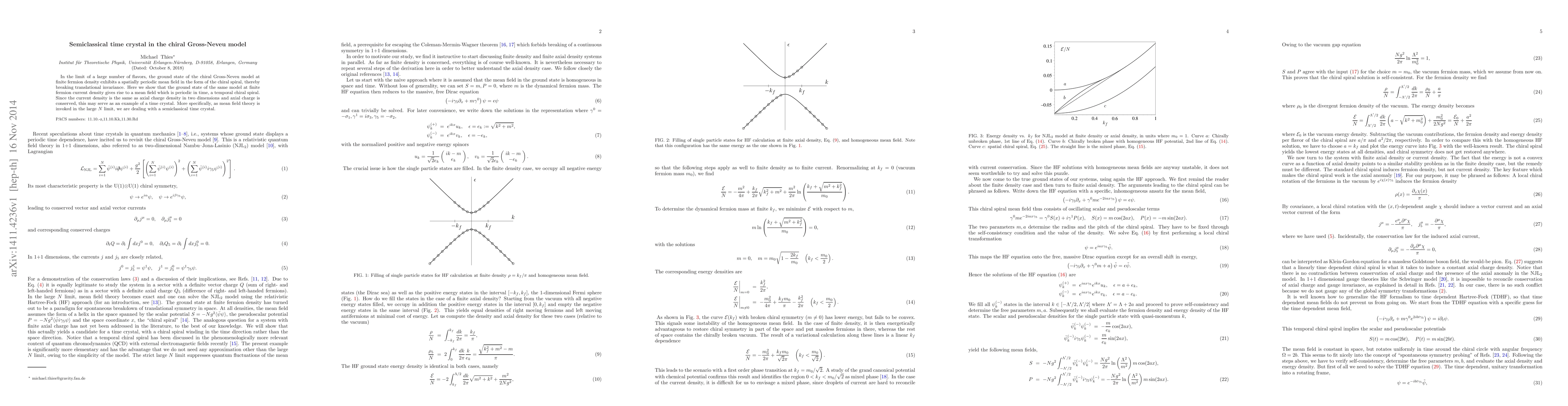 In the limit of a large number of flavors, the ground state of the chiral Gross-Neveu model at finite fermion density exhibits a spatially periodic mean field in the form of the chiral spiral, thereby breaking translational invariance. Here we show that the ground state of the same model at finite fermion current density gives rise to a mean field which is periodic in time, a temporal chiral spiral. Since the current density is the same as axial charge density in two dimensions and axial charge is conserved, this may serve as an example of a time crystal. More specifically, as mean field theory is invoked in the large N limit, we are dealing with a semiclassical time crystal.