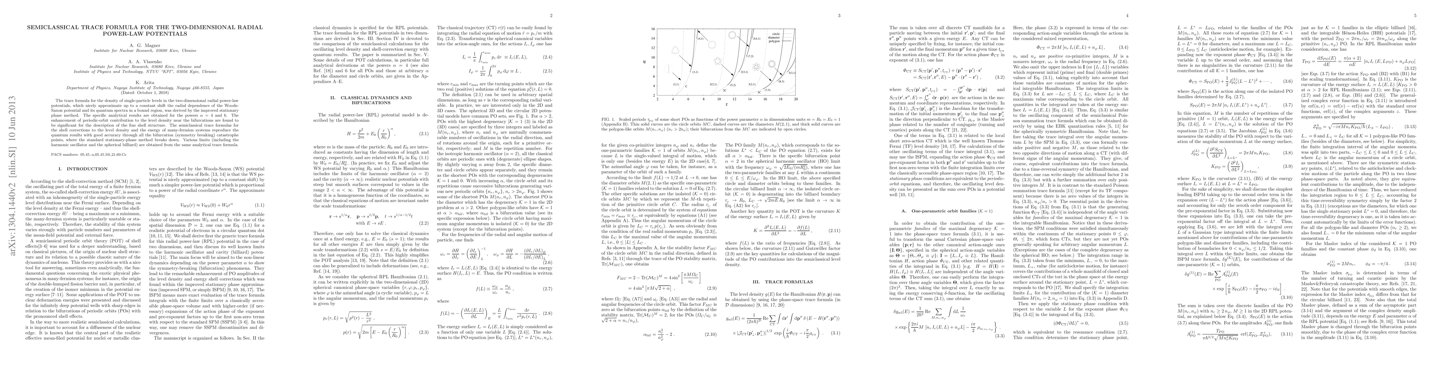 This paper derives a semiclassical trace formula for the density of single-particle levels in two-dimensional radial power-law potentials, focusing on powers 4 and 6. The method accurately captures shell corrections and reproduces quantum results, especially near bifurcation points, where traditional methods fail.