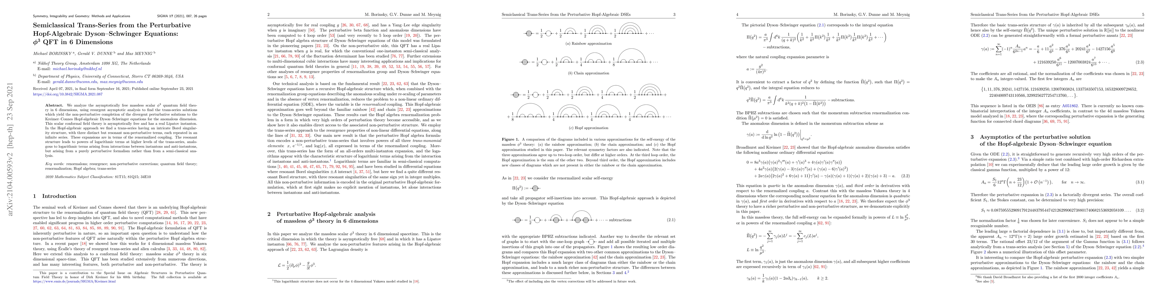 We analyze the asymptotically free massless scalar $\phi^3$ quantum field theory in 6 dimensions, using resurgent asymptotic analysis to find the trans-series solutions which yield the non-perturbative completion of the divergent perturbative solutions to the Kreimer-Connes Hopf-algebraic Dyson-Schwinger equations for the anomalous dimension. This scalar conformal field theory is asymptotically free and has a real Lipatov instanton. In the Hopf-algebraic approach we find a trans-series having an intricate Borel singularity structure, with three distinct but resonant non-perturbative terms, each repeated in an infinite series. These expansions are in terms of the renormalized coupling. The resonant structure leads to powers of logarithmic terms at higher levels of the trans-series, analogous to logarithmic terms arising from interactions between instantons and anti-instantons, but arising from a purely perturbative formalism rather than from a semi-classical analysis.