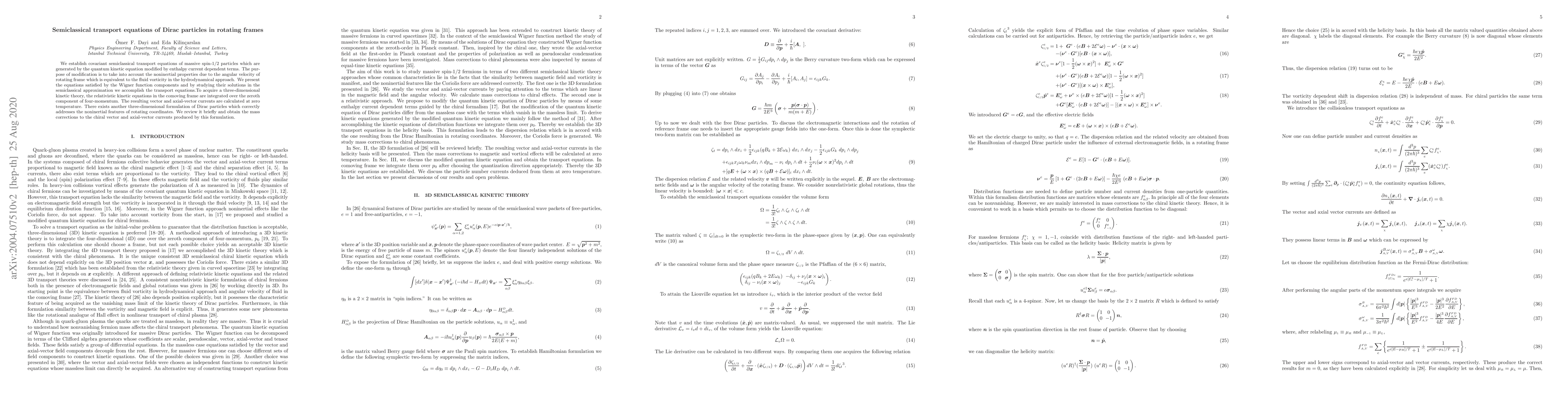 This paper establishes covariant semiclassical transport equations for Dirac particles in rotating frames, incorporating noninertial effects due to angular velocity. It integrates relativistic kinetic equations in the comoving frame to derive three-dimensional currents and reviews an alternative formulation to obtain mass corrections for chiral currents.