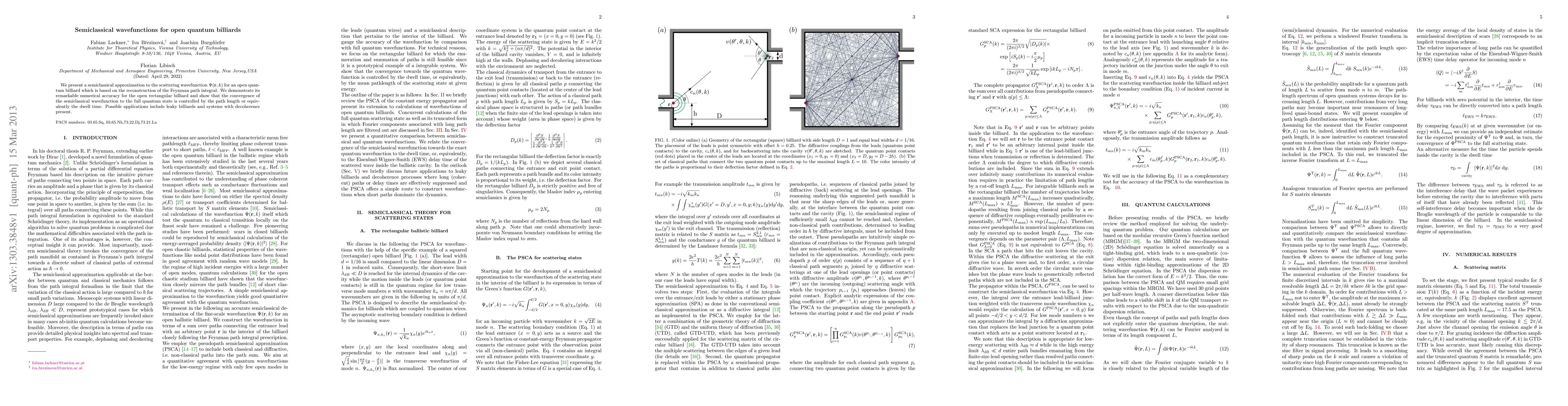 We present a semiclassical approximation to the scattering wavefunction $\Psi(\mathbf{r},k)$ for an open quantum billiard which is based on the reconstruction of the Feynman path integral. We demonstrate its remarkable numerical accuracy for the open rectangular billiard and show that the convergence of the semiclassical wavefunction to the full quantum state is controlled by the path length or equivalently the dwell time. Possible applications include leaky billiards and systems with decoherence present.