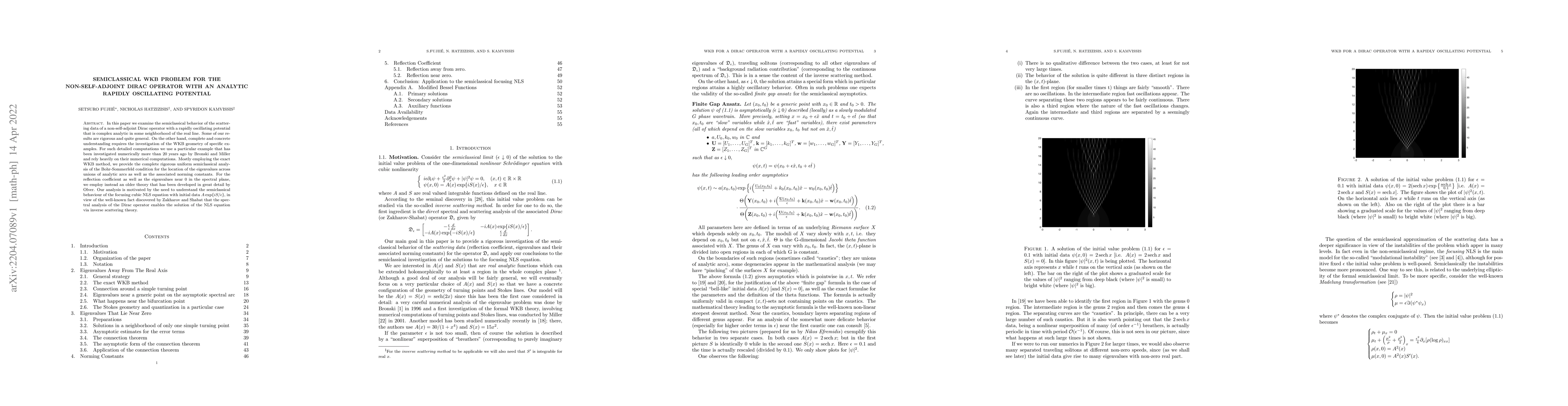 In this paper we examine the semiclassical behavior of the scattering data of a non-self-adjoint Dirac operator with a rapidly oscillating potential that is complex analytic in some neighborhood of the real line. Some of our results are rigorous and quite general. On the other hand, complete and concrete understanding requires the investigation of the WKB geometry of specific examples. For such detailed computations we use a particular example that has been investigated numerically more than 20 years ago by Bronski and Miller and rely heavily on their numerical computations. Mostly employing the exact WKB method, we provide the complete rigorous uniform semiclassical analysis of the Bohr-Sommerfeld condition for the location of the eigenvalues across unions of analytic arcs as well as the associated norming constants. For the reflection coefficient as well as the eigenvalues near 0 in the spectral plane, we employ instead an older theory that has been developed in great detail by Olver. Our analysis is motivated by the need to understand the semiclassical behaviour of the focusing cubic NLS equation with initial data $A\exp\{iS/\epsilon\}$, in view of the well-known fact discovered by Zakharov and Shabat that the spectral analysis of the Dirac operator enables the solution of the NLS equation via inverse scattering theory.