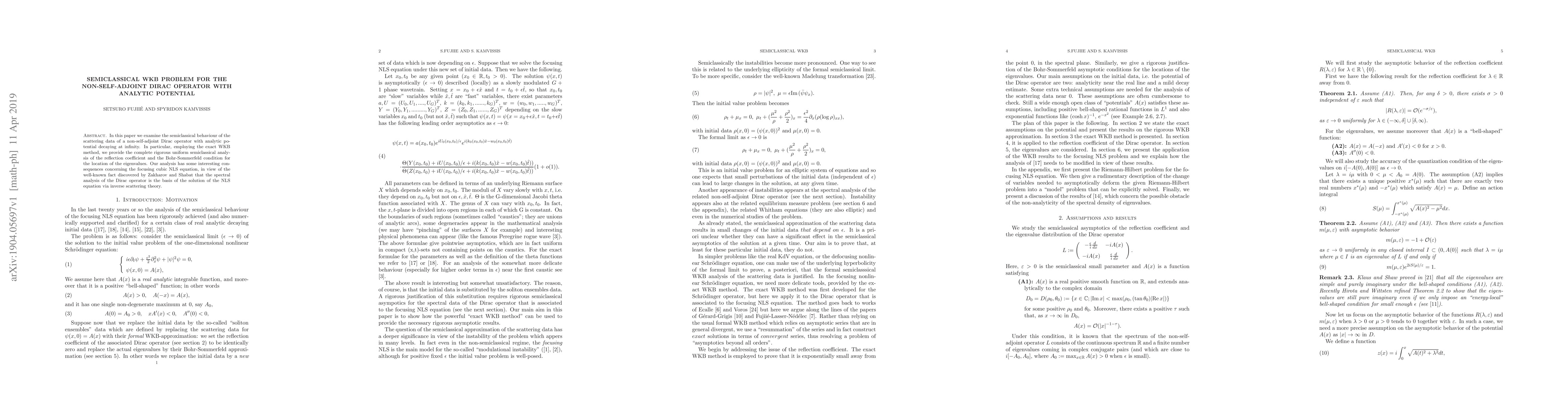 This paper rigorously analyzes the semiclassical scattering data of a non-self-adjoint Dirac operator with an analytic potential, using the exact WKB method to derive the reflection coefficient and Bohr-Sommerfeld condition for eigenvalues, with implications for the focusing cubic NLS equation via inverse scattering theory.