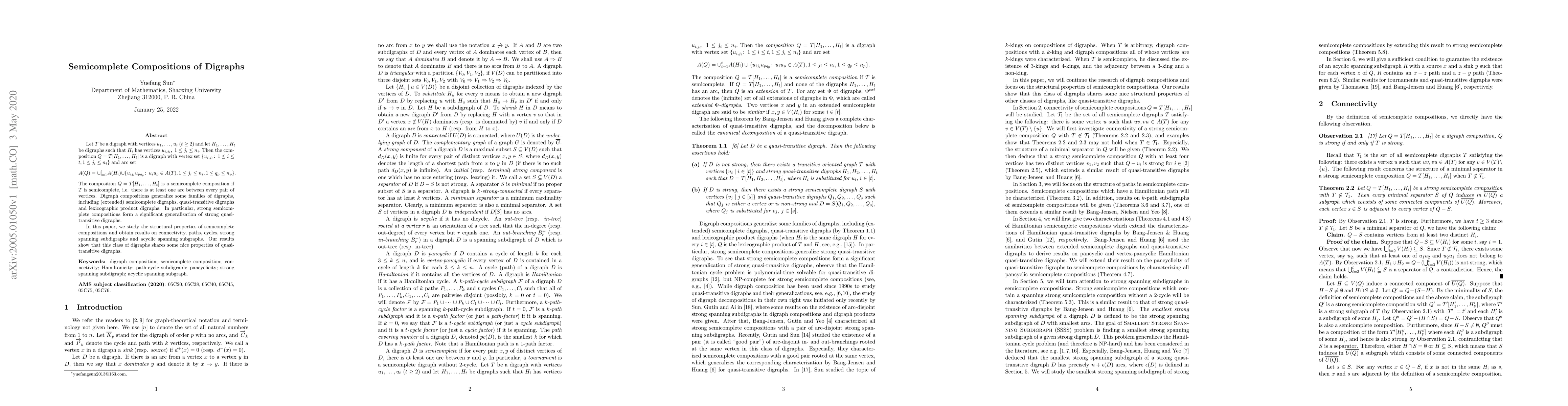 This paper investigates the structural properties of semicomplete compositions of digraphs, focusing on connectivity, paths, cycles, and spanning subgraphs. It demonstrates that these compositions share desirable properties with quasi-transitive digraphs, including the formation of strong spanning subdigraphs and acyclic spanning subgraphs.