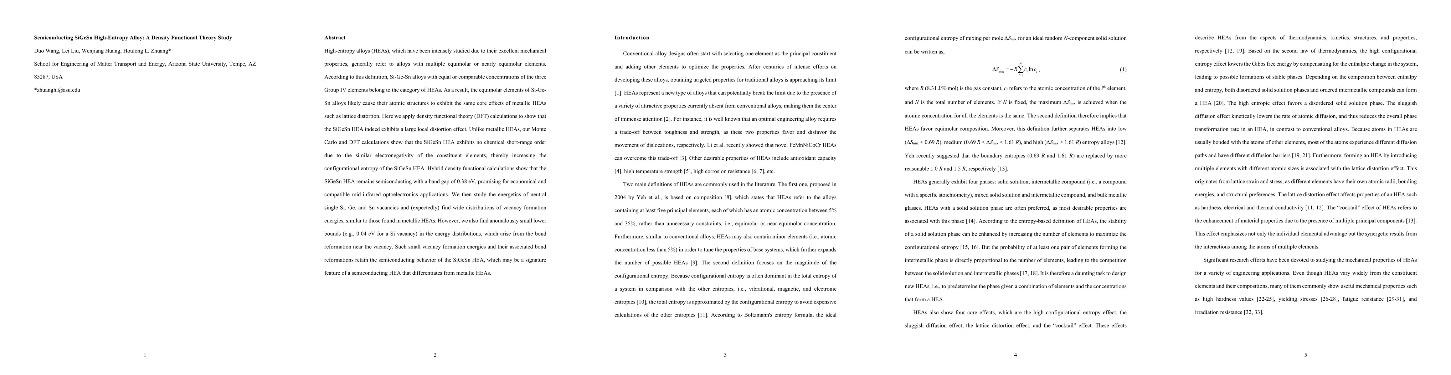 This study uses density functional theory to demonstrate that the SiGeSn high-entropy alloy exhibits significant local lattice distortion and maintains semiconducting properties with a band gap of 0.38 eV, suitable for mid-infrared optoelectronics. Unlike metallic HEAs, it shows no chemical short-range order due to similar electronegativity, enhancing its configurational entropy.