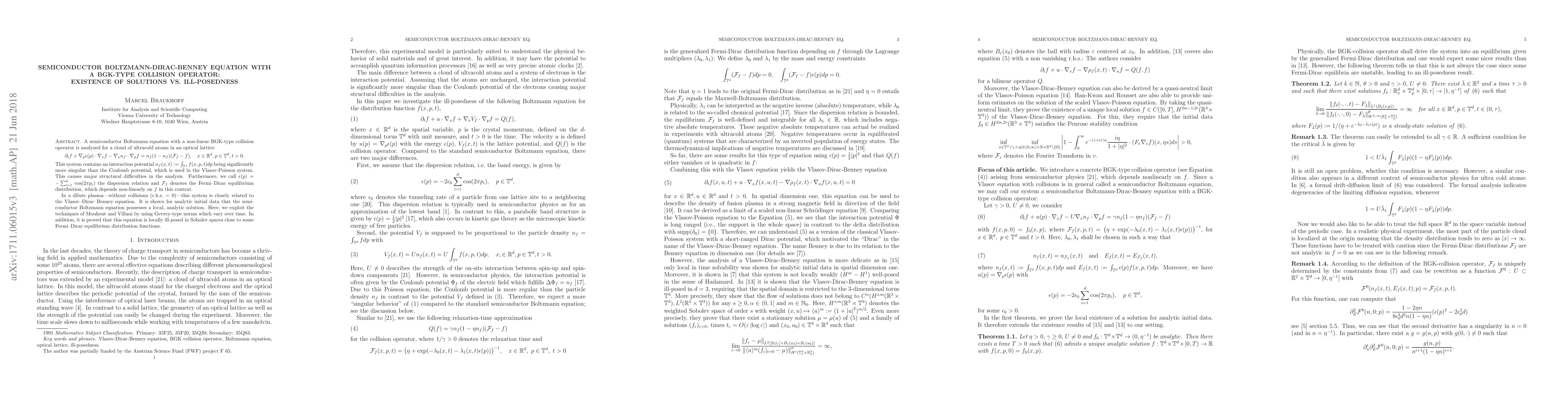 A semiconductor Boltzmann equation with a non-linear BGK-type collision operator is analyzed for a cloud of ultracold atoms in an optical lattice: \[ \partial_t f + \nabla_p\epsilon(p)\cdot\nabla_x f - \nabla_x n_f\cdot\nabla_p f = n_f(1- n_f)(\mathcal{F}_f-f), \quad x\in\mathbb{R}^d, p\in\mathbb{T}^d, t>0. \] This system contains an interaction potential $n_f(x,t):=\int_{\mathbb{T}^d}f(x,p,t)dp$ being significantly more singular than the Coulomb potential, which is used in the Vlasov-Poisson system. This causes major structural difficulties in the analysis. Furthermore, $\epsilon(p) = -\sum_{i=1}^d$ $\cos(2\pi p_i)$ is the dispersion relation and $\mathcal{F}_f$ denotes the Fermi-Dirac equilibrium distribution, which depends non-linearly on $f$ in this context. In a dilute plasma - without collisions (r.h.s$.=0$) - this system is closely related to the Vlasov-Dirac-Benney equation. It is shown for analytic initial data that the semiconductor Boltzmann equation possesses a local, analytic solution. Here, we exploit the techniques of Mouhout and Villani by using Gevrey-type norms which vary over time. In addition, it is proved that this equation is locally ill-posed in Sobolev spaces close to some Fermi-Dirac equilibrium distribution functions.