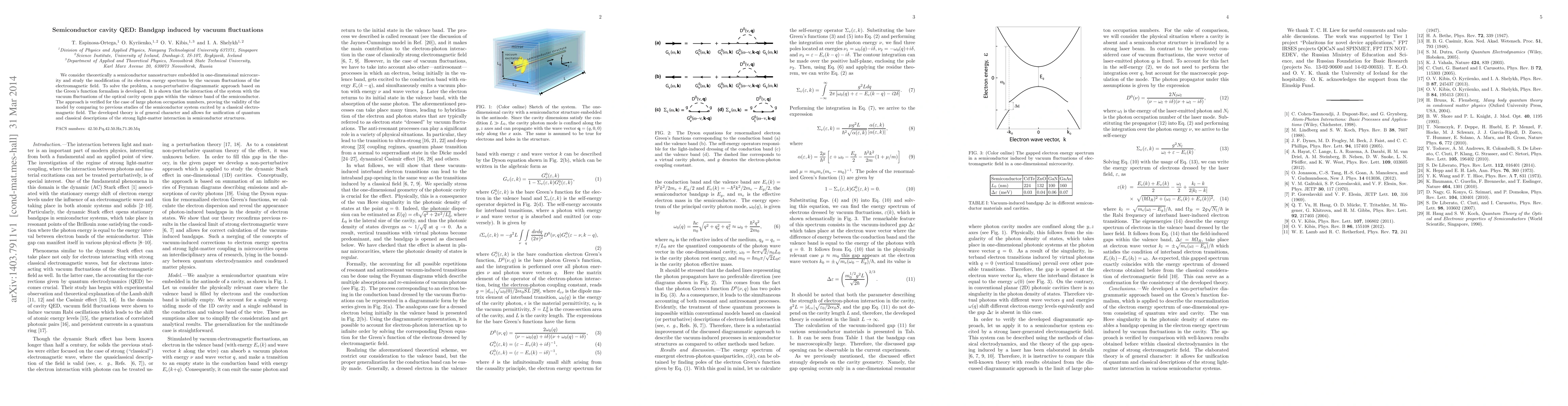 We consider theoretically a semiconductor nanostructure embedded in one-dimensional microcavity and study the modification of its electron energy spectrum by the vacuum fluctuations of the electromagnetic field. To solve the problem, a non-perturbative diagrammatic approach based on the Green's function formalism is developed. It is shown that the interaction of the system with the vacuum fluctuations of the optical cavity opens gaps within the valence band of the semiconductor. The approach is verified for the case of large photon occupation numbers, proving the validity of the model by comparing to previous studies of the semiconductor system excited by a classical electromagnetic field. The developed theory is of general character and allows for unification of quantum and classical descriptions of the strong light-matter interaction in semiconductor structures.