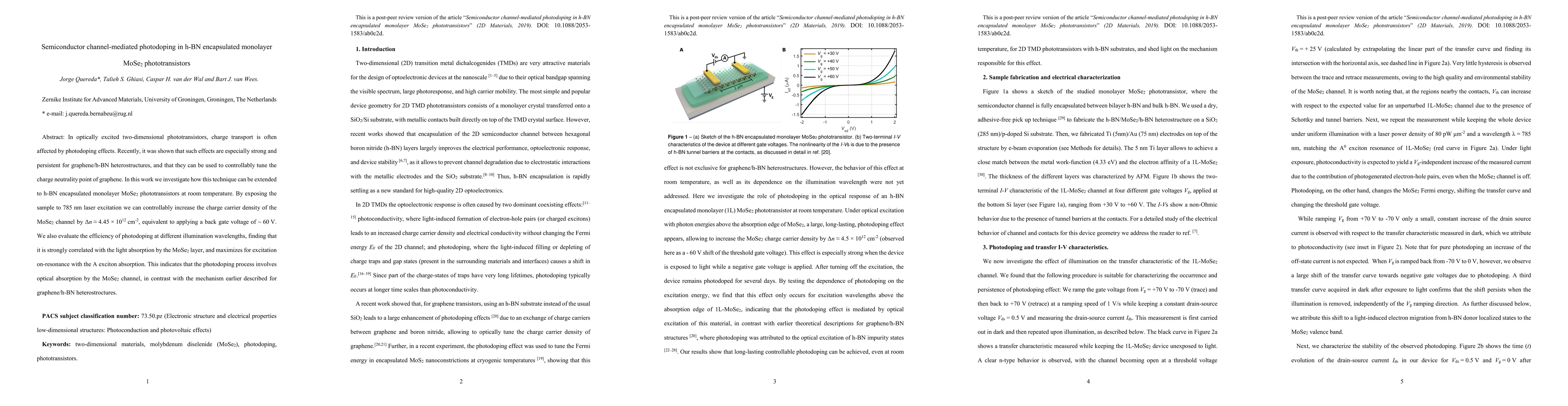 This study investigates the photodoping effects in h-BN encapsulated monolayer MoSe2 phototransistors, demonstrating a controllable increase in charge carrier density by 4.45 × 10^12 cm^-2 using 785 nm laser excitation, equivalent to a 60 V back gate voltage. The efficiency of photodoping is found to be strongly correlated with the light absorption by the MoSe2 layer, indicating a different mechanism compared to graphene/h-BN heterostructures.