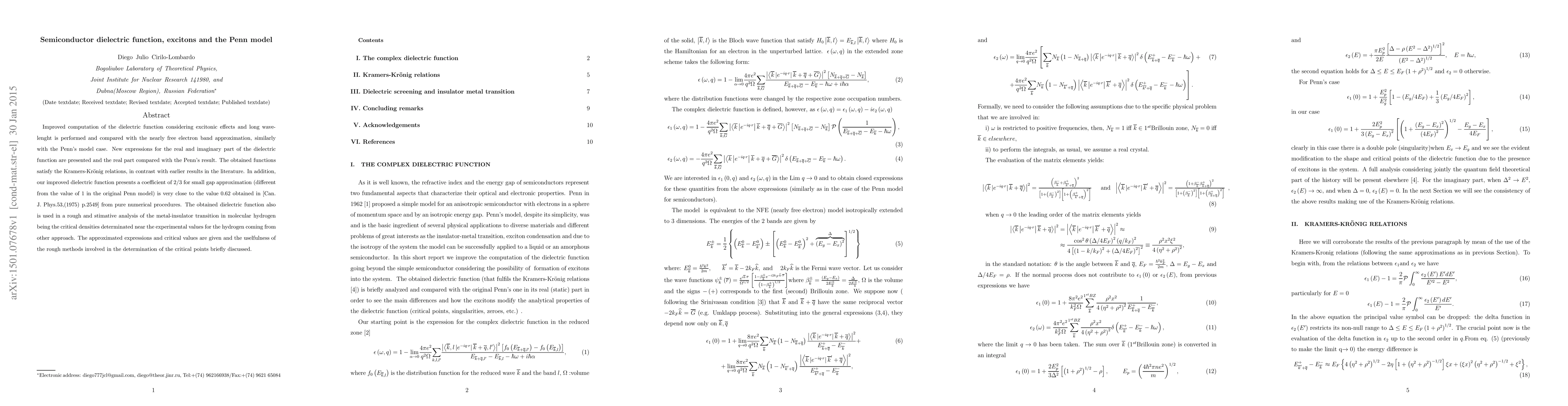 Improved computation of the dielectric function considering excitonic effects and long wavelength is performed and compared with the nearly free electron band approximation, similarly with the Penn's model case. New expressions for the real and imaginary part of the dielectric function are presented and the real part compared with the Penn's result. The obtained functions satisfy the Kramers-Kr\"onig relations, in contrast with earlier results in the literature. In addition, our improved dielectric function presents a coeficient of 2/3 for small gap approximation (different from the value of 1 in the original Penn model) is very close to the value 0.62 obtained in [Can. J. Phys.53,(1975) p.2549] from pure numerical procedures. The obtained dielectric function also is used in a rough and stimative analysis of the metal-insulator transition in molecular hydrogen being the critical densities determined near the experimental values for the hydrogen coming from other approach. The approximated expressions and critical values are given and the usefulness of the rough methods involved in the determination of the critical points briefly discussed.