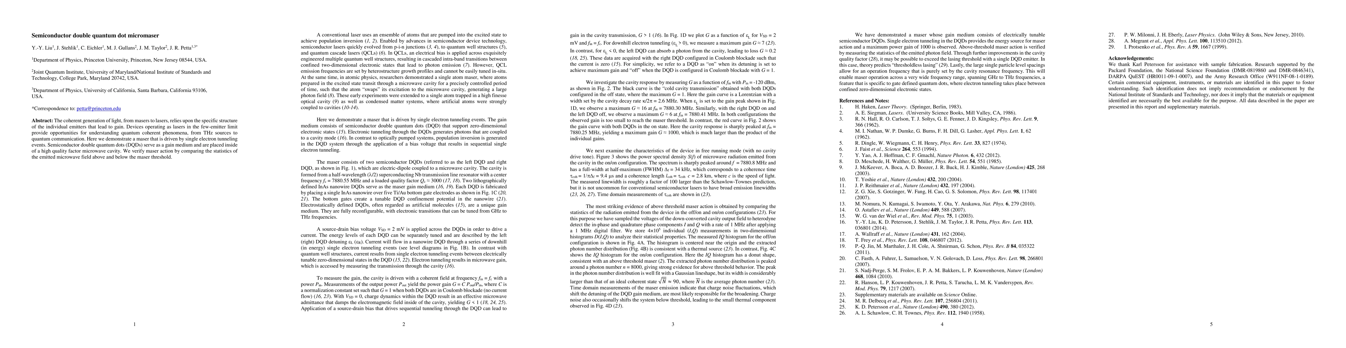 This paper demonstrates a semiconductor double quantum dot micromaser driven by single electron tunneling events, utilizing a high-quality factor microwave cavity as its gain medium. The maser action is verified through statistical analysis of the emitted microwave field above and below the threshold.