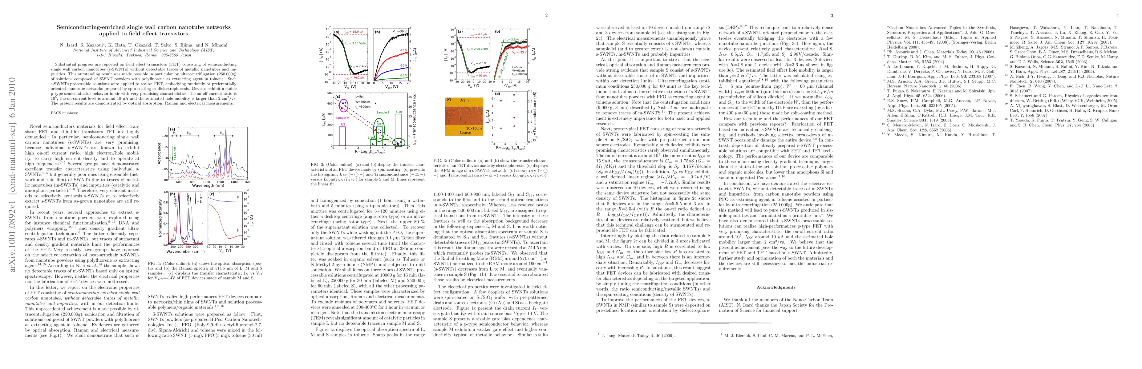 Substantial progress on field effect transistors "FETs" consisting of semiconducting single wall carbon nanotubes "s-SWNTs" without detectable traces of metallic nanotubes and impurities is reported. Nearly perfect removal of metallic nanotubes is confirmed by optical absorption, Raman measurements, and electrical measurements. This outstanding result was made possible in particular by ultracentrifugation (150 000 g) of solutions prepared from SWNT powders using polyfluorene as an extracting agent in toluene. Such s-SWNTs processable solutions were applied to realize FET, embodying randomly or preferentially oriented nanotube networks prepared by spin coating or dielectrophoresis. Devices exhibit stable p-type semiconductor behavior in air with very promising characteristics. The on-off current ratio is 10^5, the on-current level is around 10 $\mu$A, and the estimated hole mobility is larger than 2 cm2 / V s.