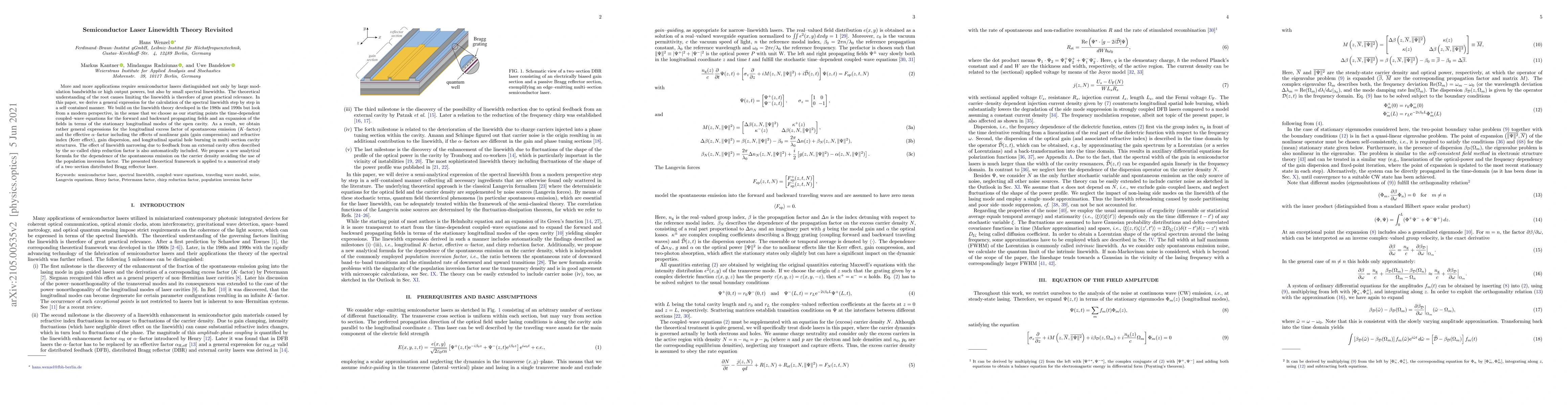 More and more applications require semiconductor lasers distinguished not only by large modulation bandwidths or high output powers, but also by small spectral linewidths. The theoretical understanding of the root causes limiting the linewidth is therefore of great practical relevance. In this paper, we derive a general expression for the calculation of the spectral linewidth step by step in a self-contained manner. We build on the linewidth theory developed in the 1980s and 1990s but look from a modern perspective, in the sense that we choose as our starting points the time-dependent coupled-wave equations for the forward and backward propagating fields and an expansion of the fields in terms of the stationary longitudinal modes of the open cavity. As a result, we obtain rather general expressions for the longitudinal excess factor of spontaneous emission ($K$-factor) and the effective $\alpha$-factor including the effects of nonlinear gain (gain compression) and refractive index (Kerr effect), gain dispersion and longitudinal spatial hole burning in multi-section cavity structures. The effect of linewidth narrowing due to feedback from an external cavity often described by the so-called chirp reduction factor is also automatically included. We propose a new analytical formula for the dependence of the spontaneous emission on the carrier density avoiding the use of the population inversion factor. The presented theoretical framework is applied to a numerical study of a two-section distributed Bragg reflector laser.